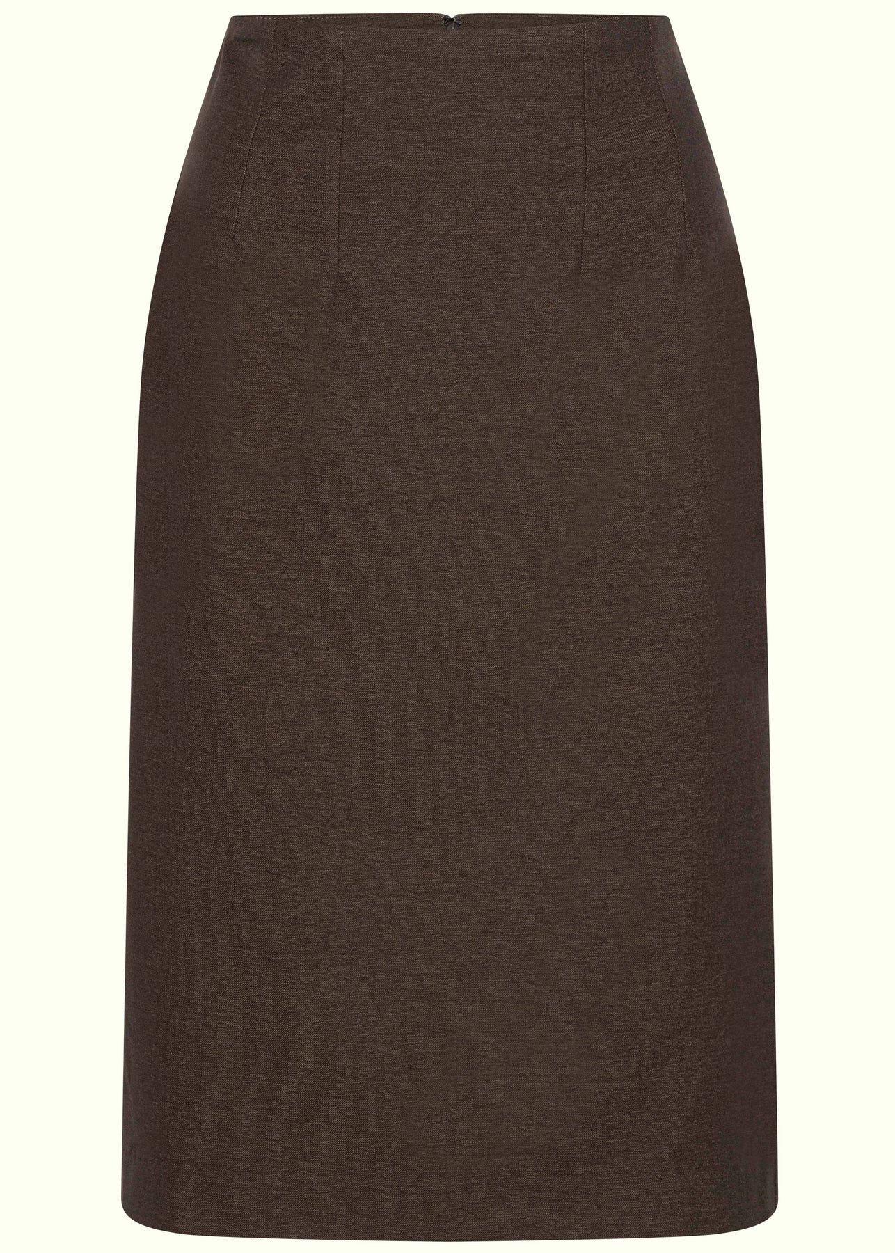 The dark brown denim-style weave gives the skirt a relaxed yet sophisticated finish – perfect for both everyday wear and special occasions. A classic back slit allows easy movement, so you can glide through your day (and evening) with effortless grace.