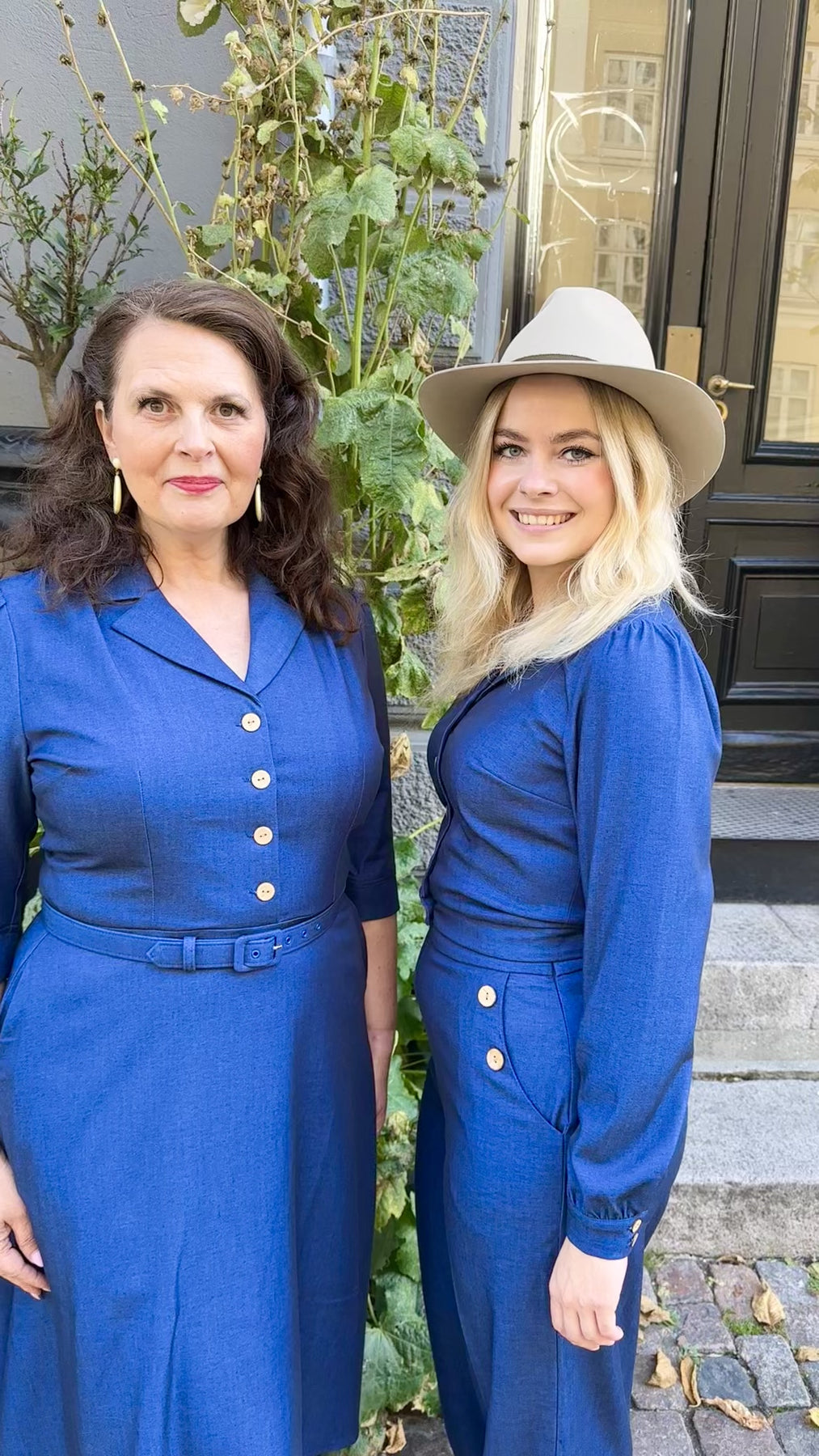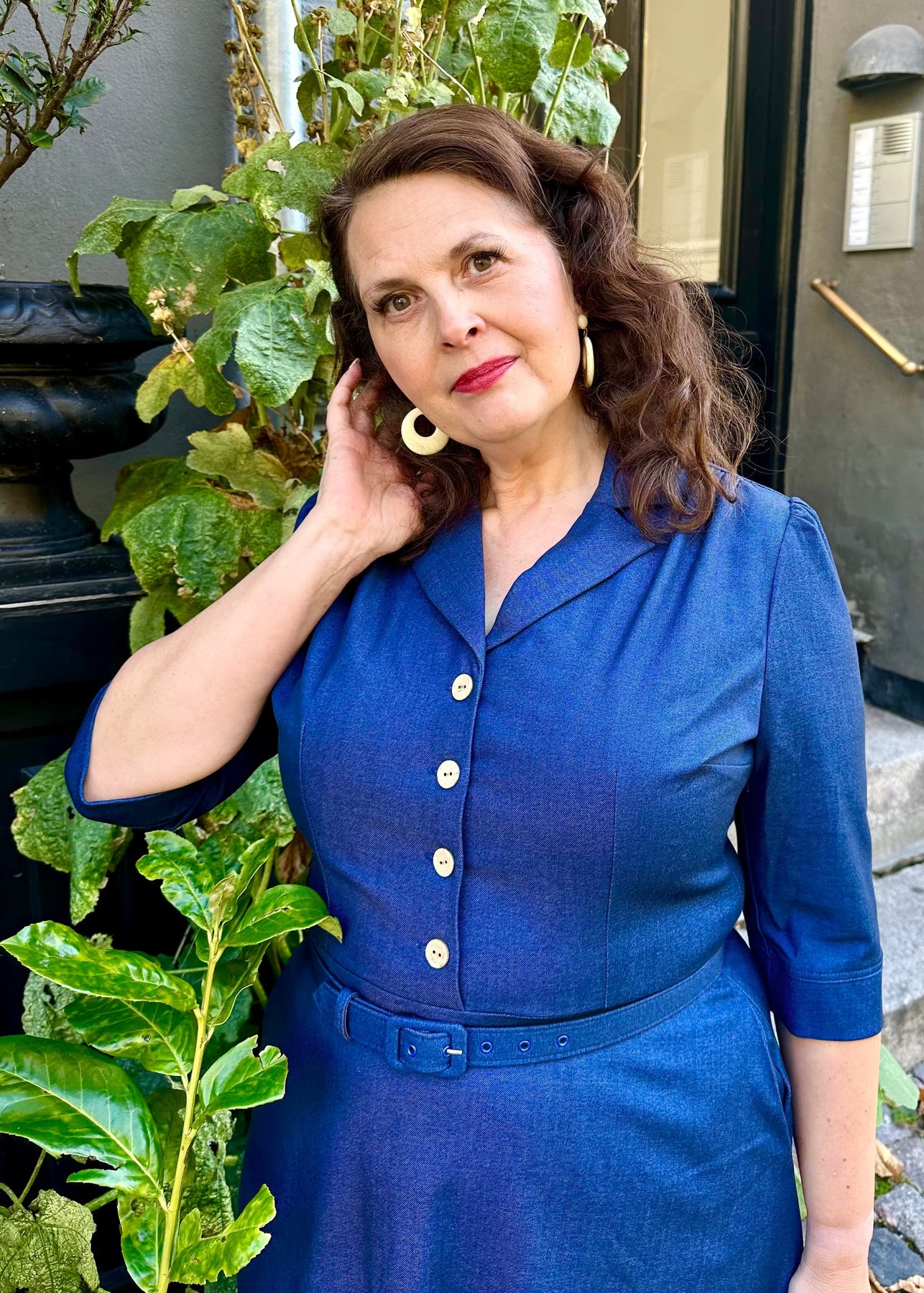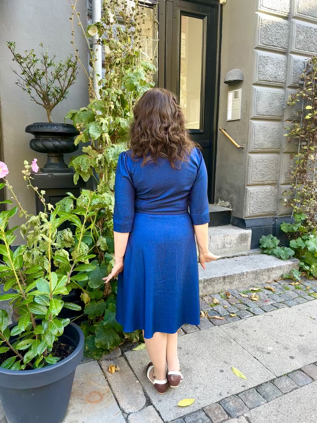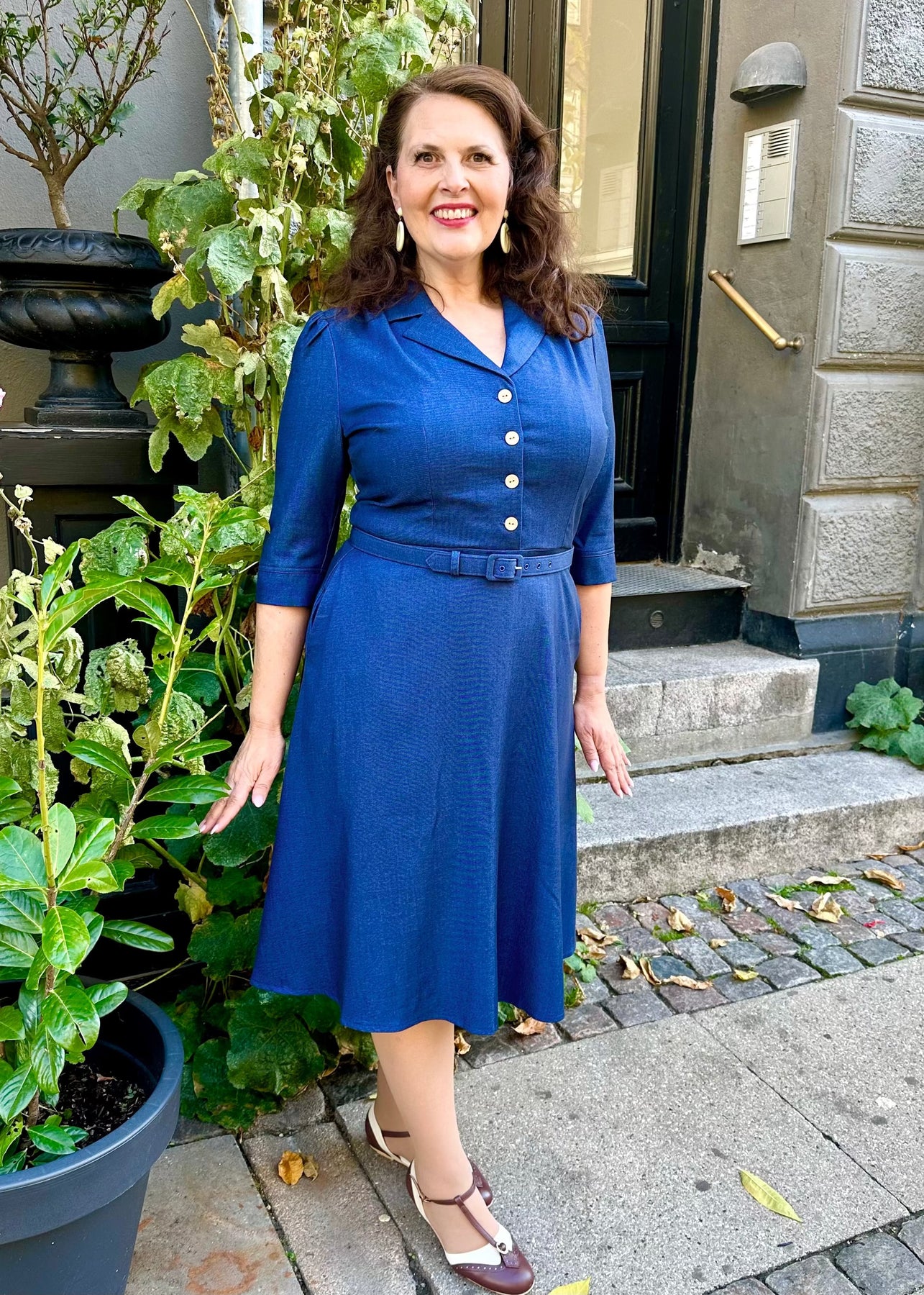 The elegant shirt collar and soft V-neckline frame the face beautifully, while gentle pleats at the shoulders provide room for the bust. The tailored seams and matching waist tie define the waist, creating a chic 1950s-inspired silhouette – a look that radiates retro style and timeless elegance.