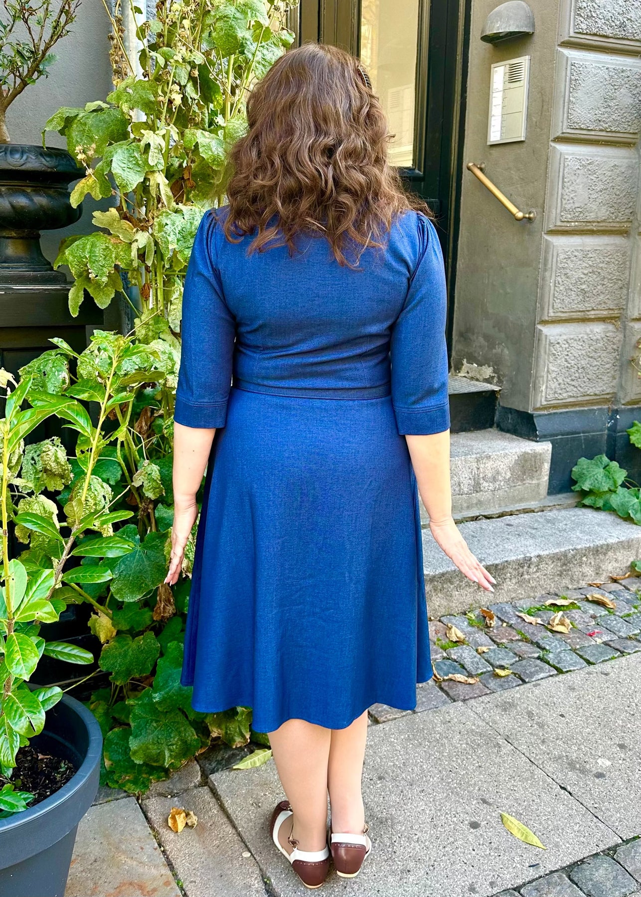 The fabric is a soft, stretchy material with a dark blue denim look that feels comfortable against the skin and allows for easy movement. A perfect choice for those who love vintage style but want everyday comfort with an elegant twist.