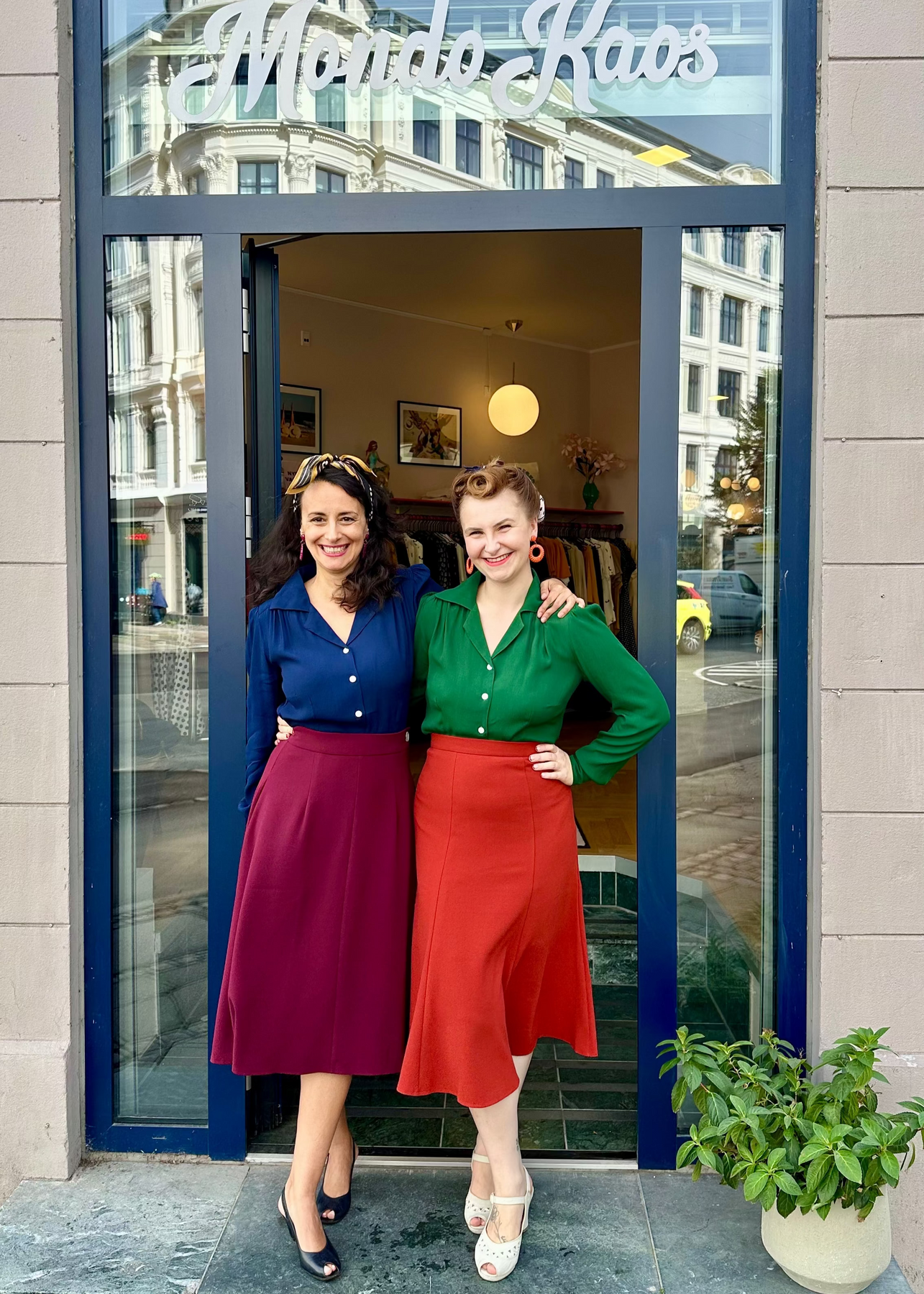 The Gene shirt features the classic notched collar in true 1940s style, draping gracefully over the shoulders. It fastens at the front with elegant mother-of-pearl buttons.