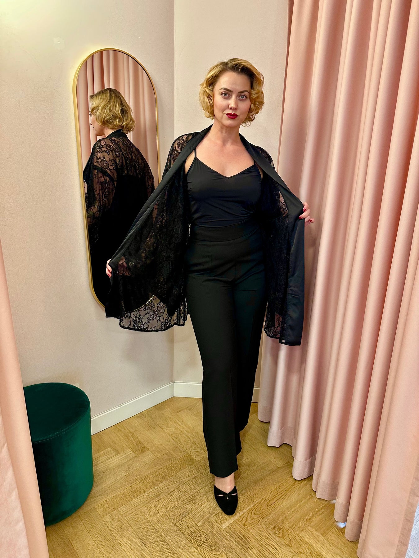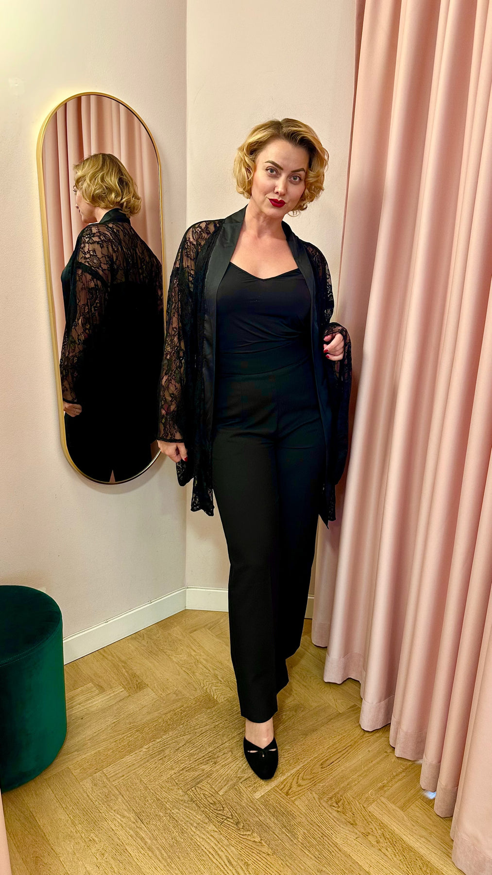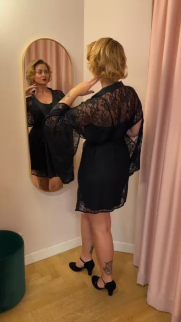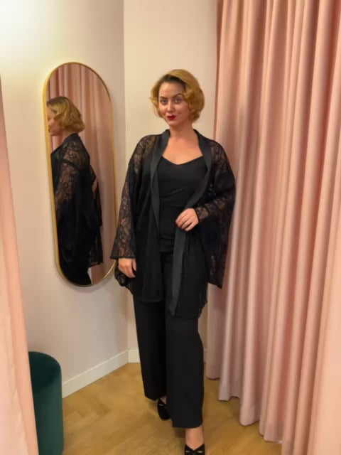 Transform any moment into pure vintage elegance with this stunning black lace kimono. With its dramatic wide sleeves and sleek satin trim, it exudes classic boudoir allure and Old Hollywood sophistication – while remaining effortlessly versatile.