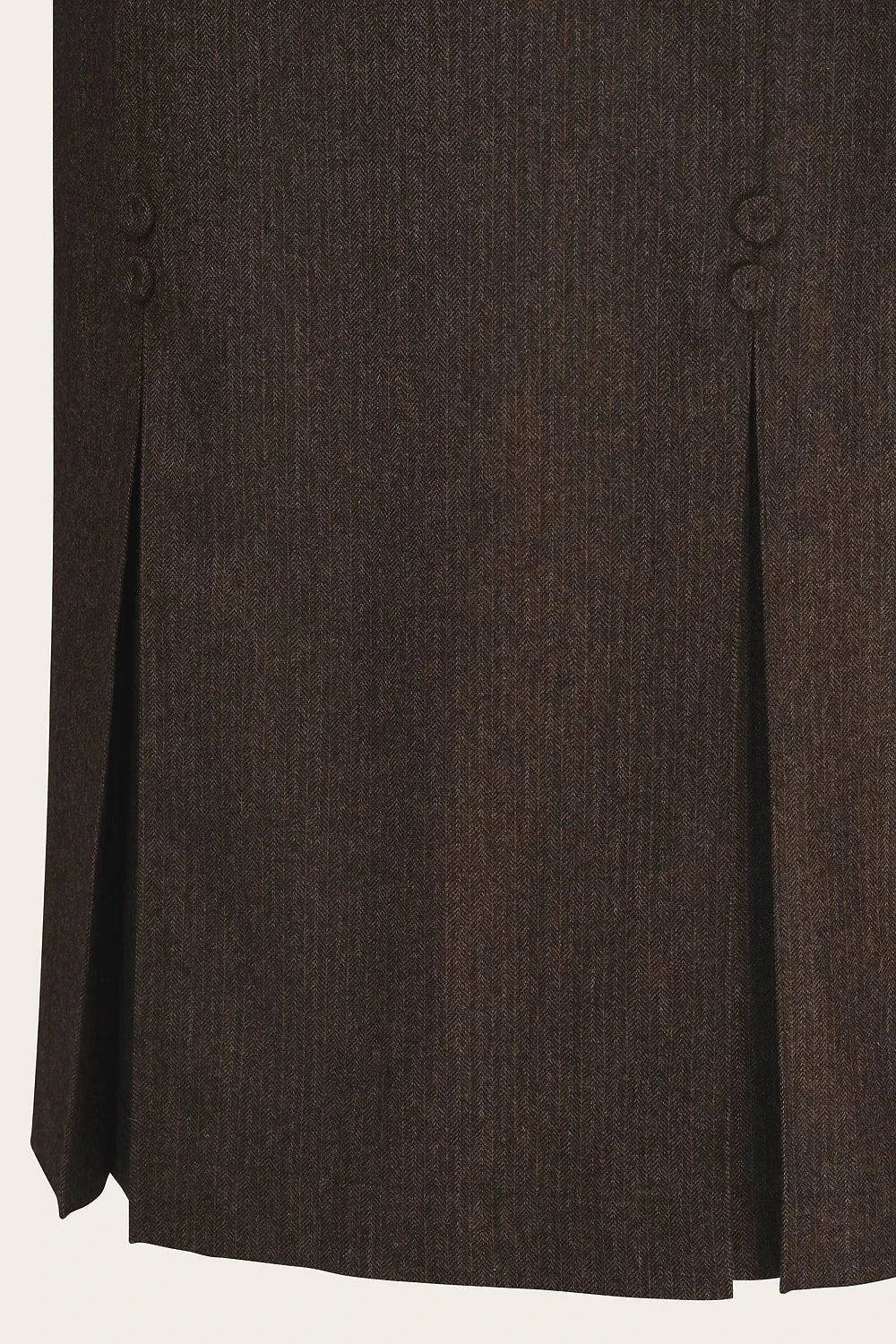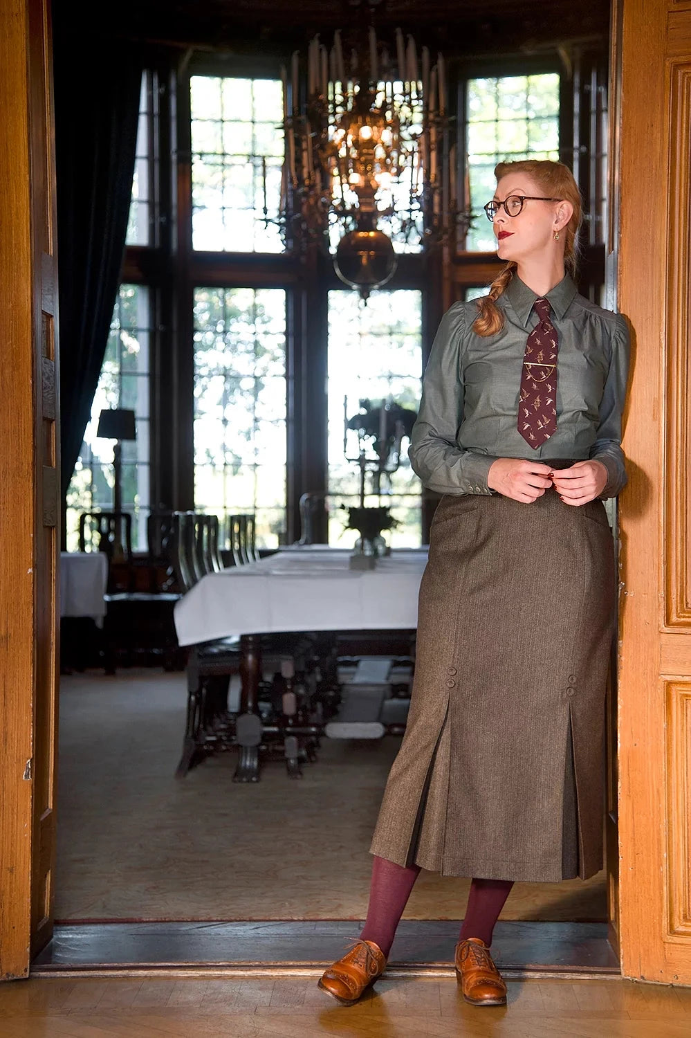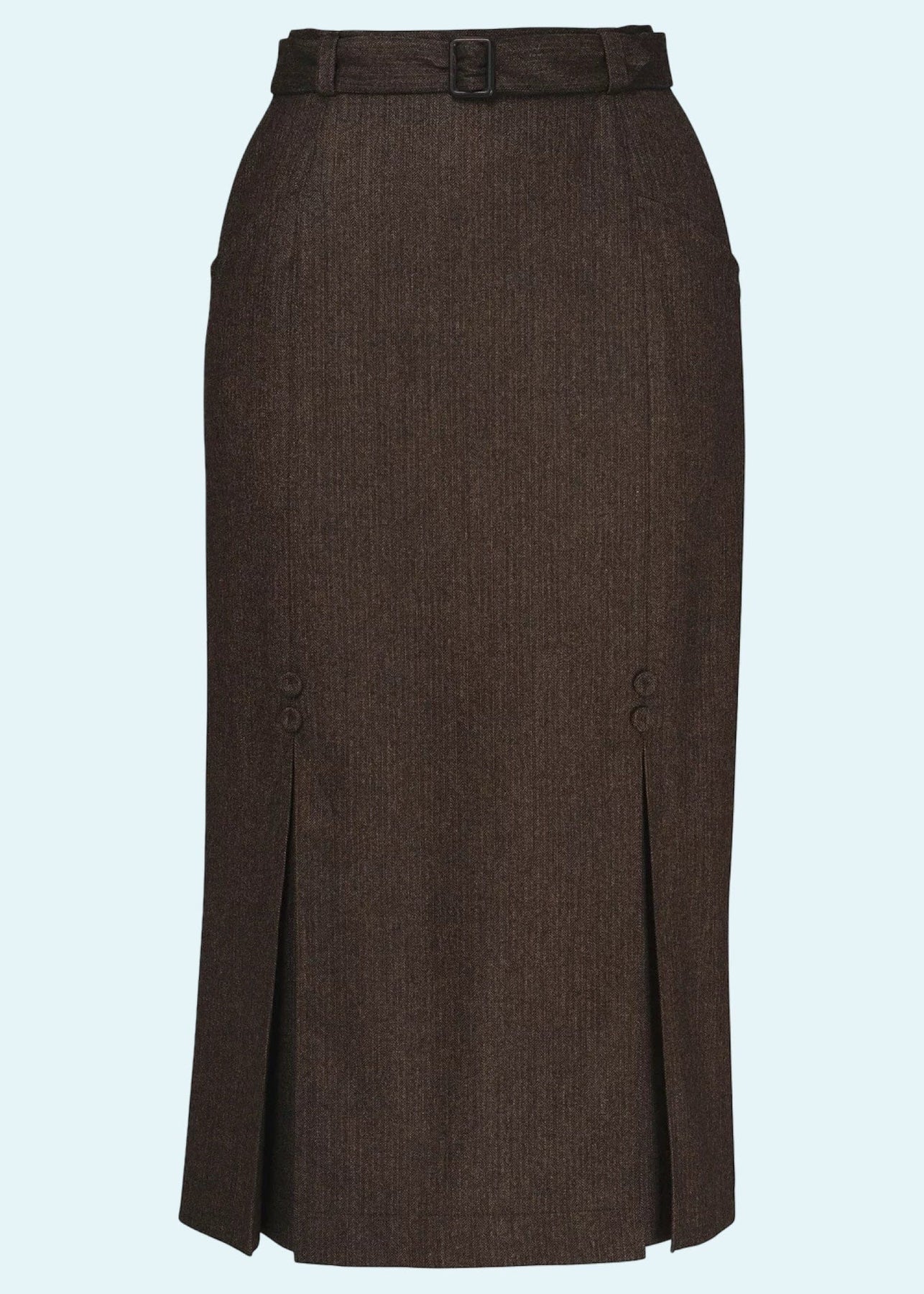 Elegant pencil skirt inspireret af 1930’erne med store lommer, kick pleats og bæltestropper. En klassiker med vintage charme og moderne funktionalitet.