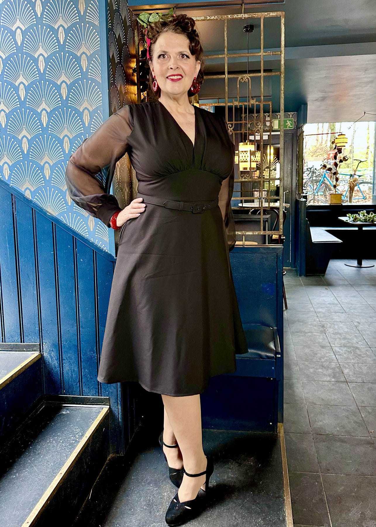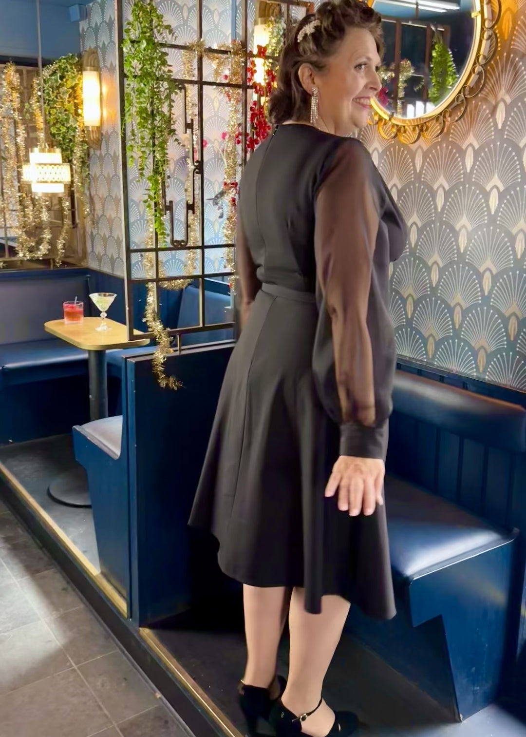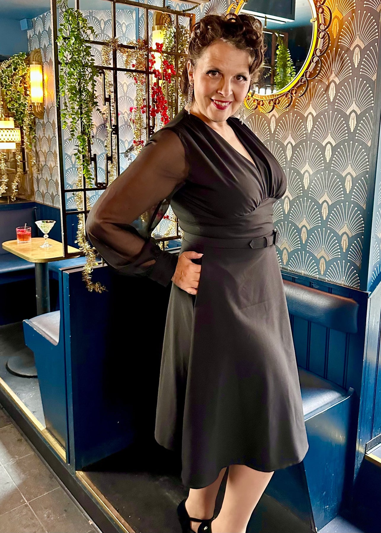 The Marilyn dress from Daisy Dapper, but with an A-line skirt and long chiffon sleeves, perfect for seasonal parties!
