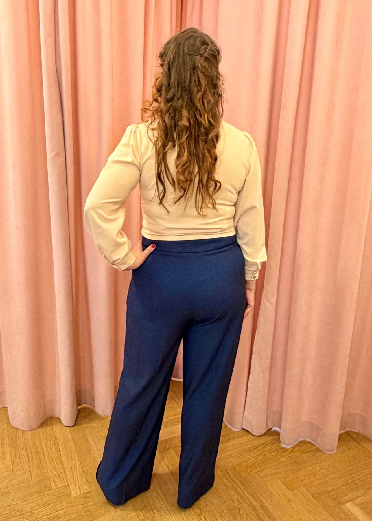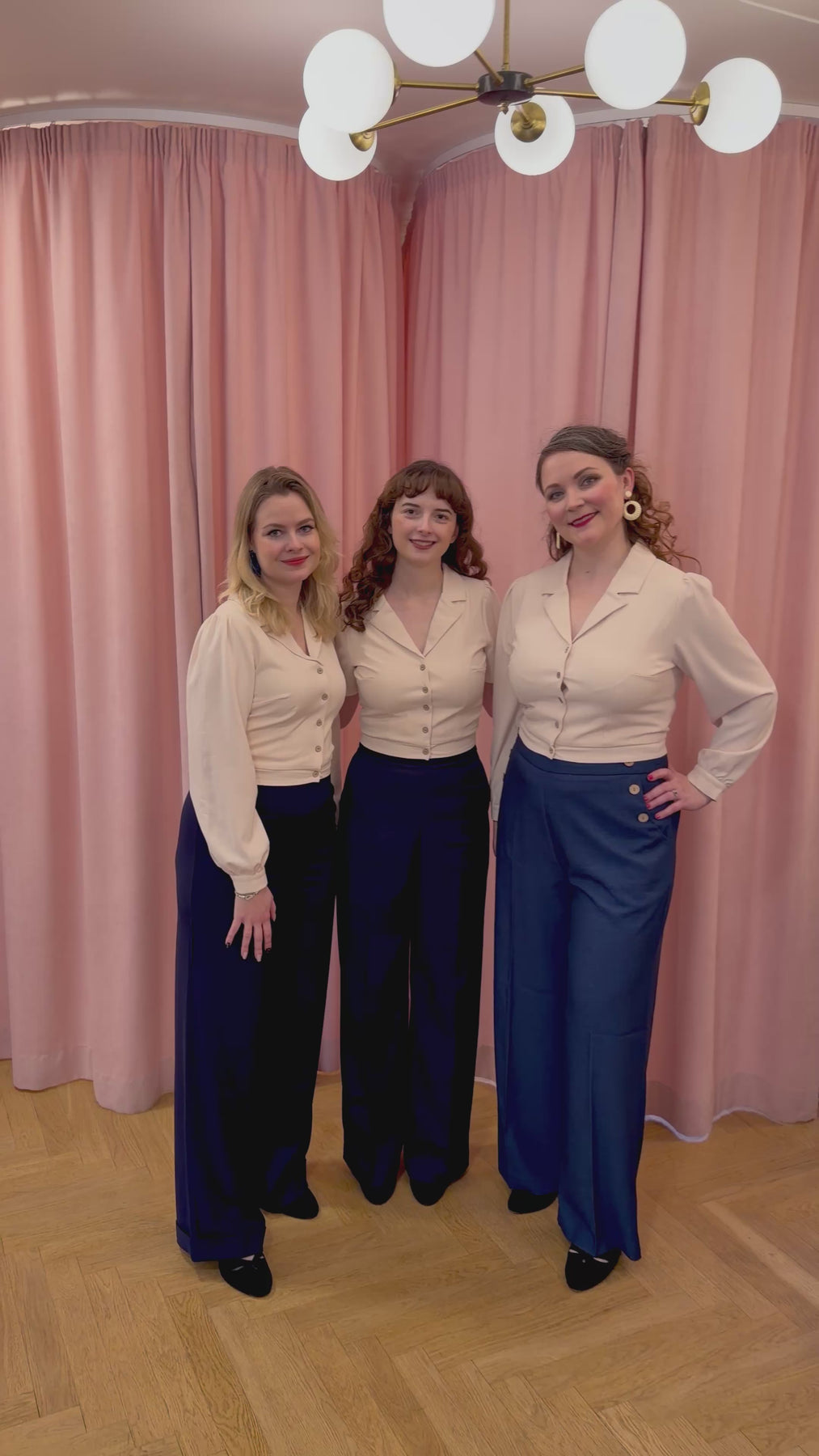 The Daisy blouse features a classic notched collar that opens into a soft V-neckline, and the front fastens with five small coconut buttons. The fixed waistband highlights the waist beautifully and creates the flattering hourglass silhouette that defines true 1940s style.