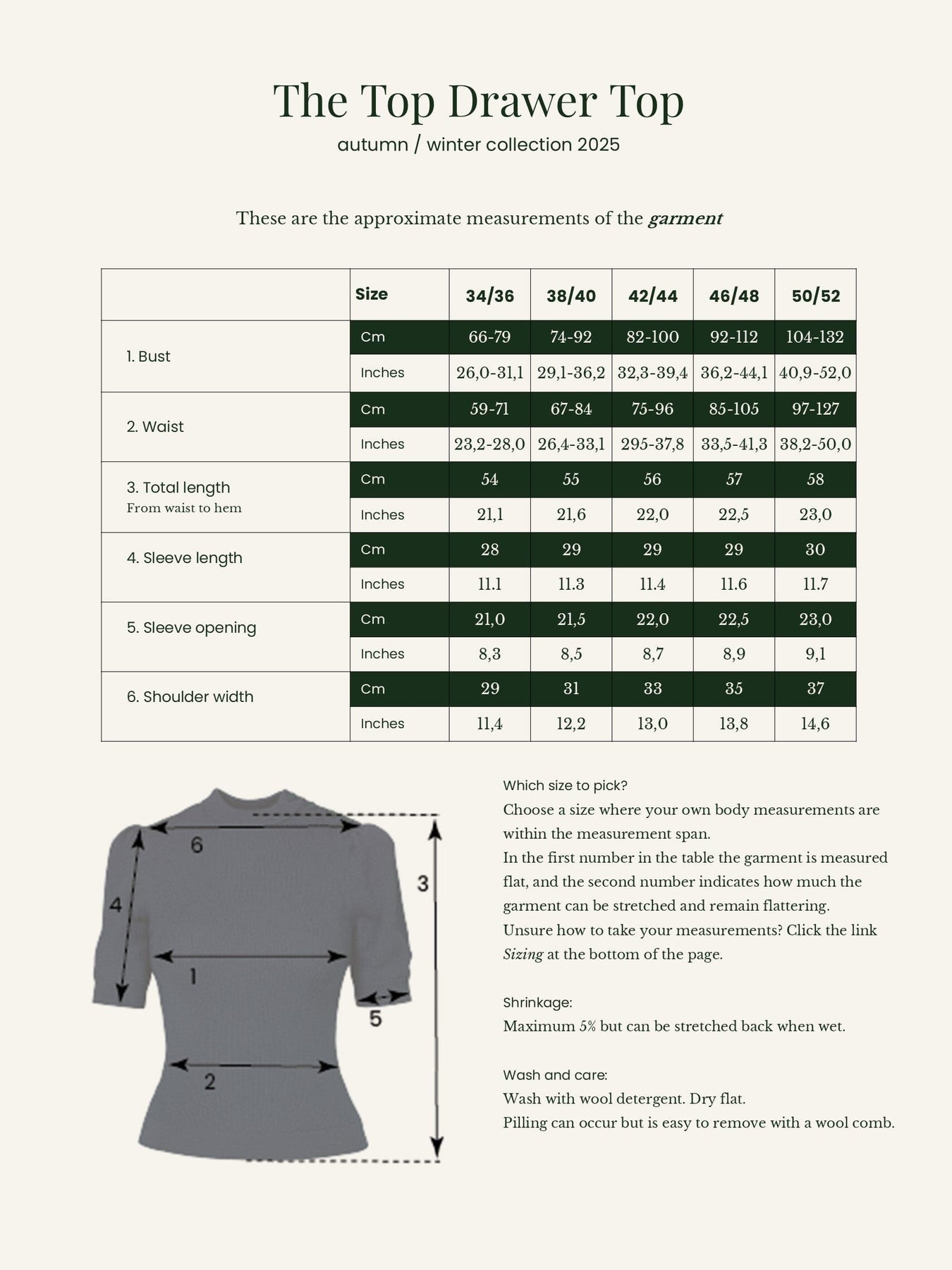 The elegant Top Drawer Top comes with a rounded, high neckline and buttons along the left shoulder for an authentic vintage touch. The puffed short sleeves finish with a ribbed cuff that adds subtle volume, while the lightweight merino wool ensures both comfort and a flattering fit. Designed to sit close to the body, this knit highlights the feminine hourglass silhouette.