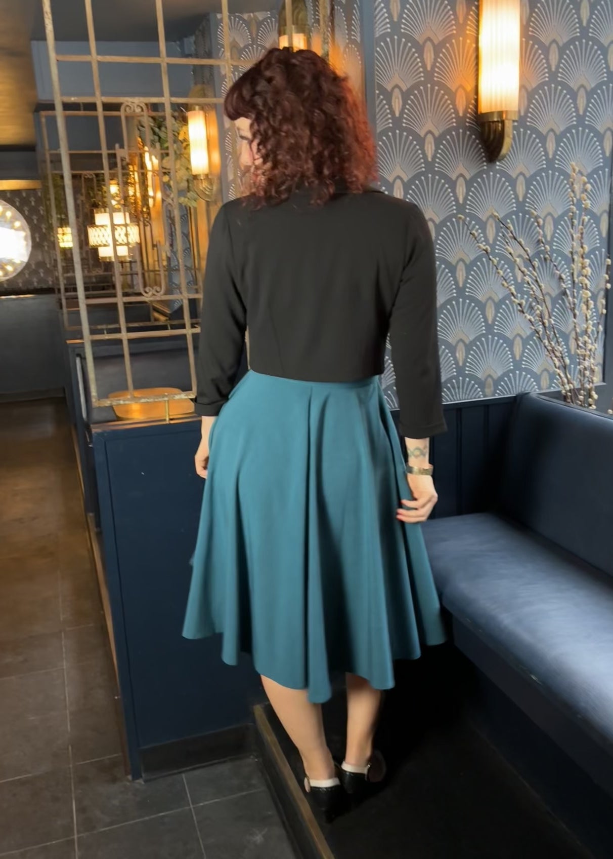 The bolero has a simple and elegant 1950s style collar and closes at the front with small fabric-covered buttons. The bolero has fine incisions and stitching to hug the body perfectly and it ends at the top of the natural waist to give extra focus to the hourglass figure and your beautiful fitted dresses.