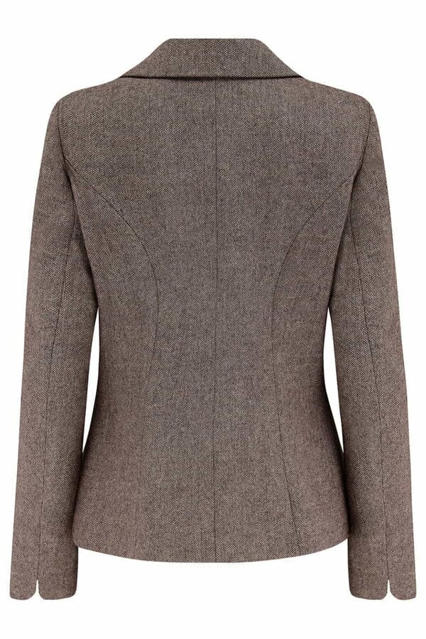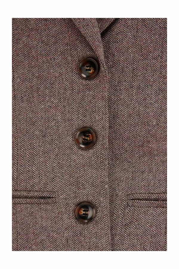 Crafted from a soft wool blend in a rich brown herringbone pattern, the blazer is fully lined for comfort.