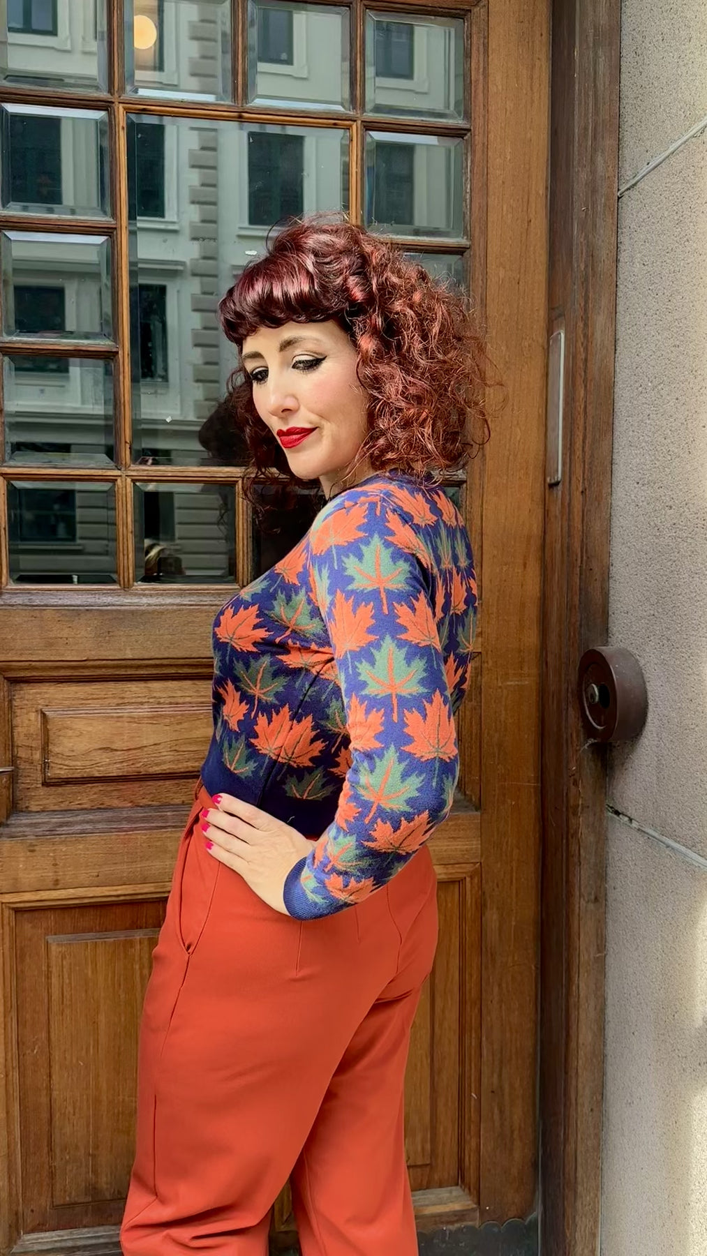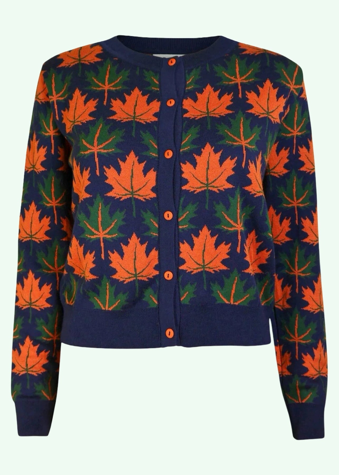 The Vera Jacquard cardigan is knitted in organic cotton with a beautifully woven leaf pattern. A classic and versatile cardigan, perfect for styling with both vintage dresses and high-waisted trousers.