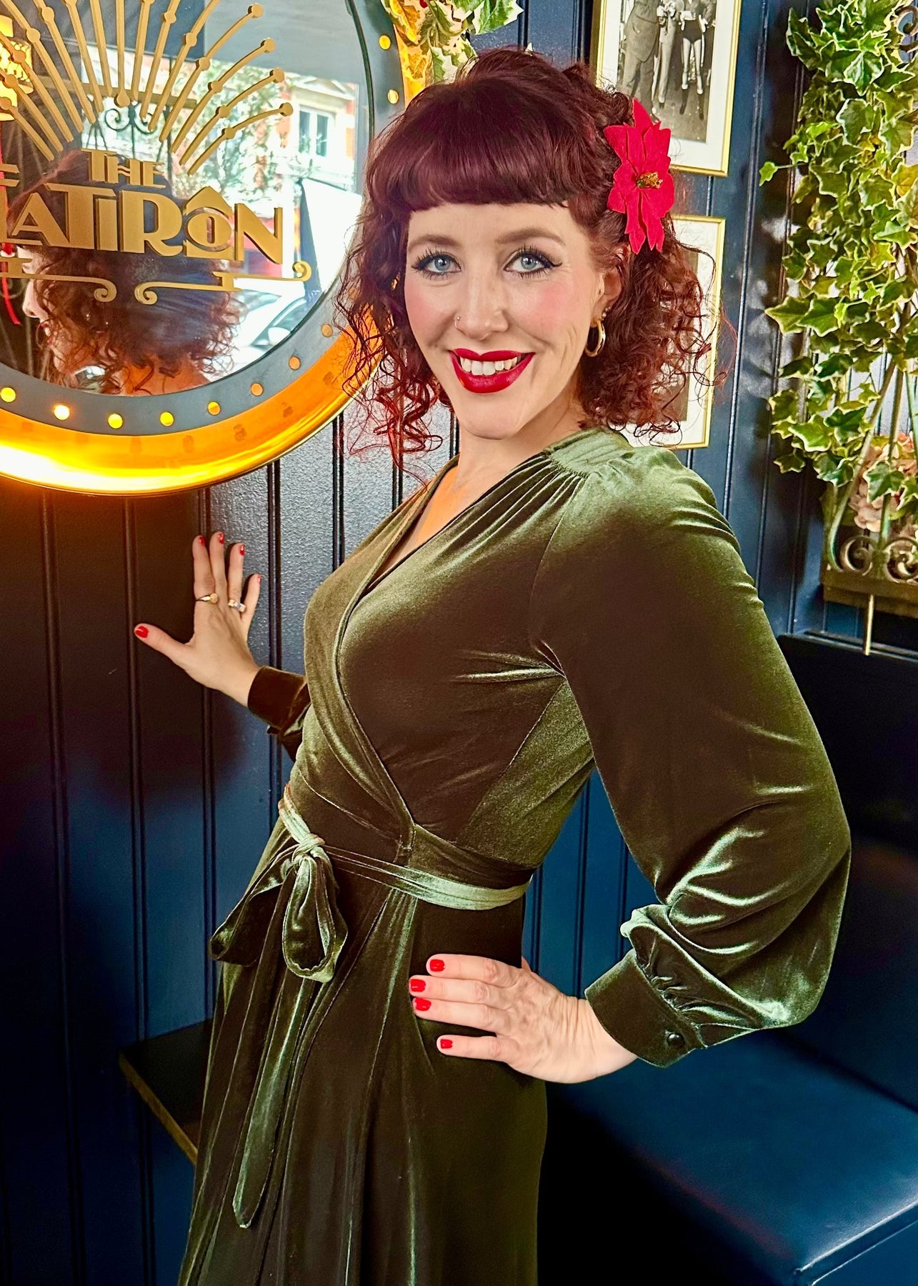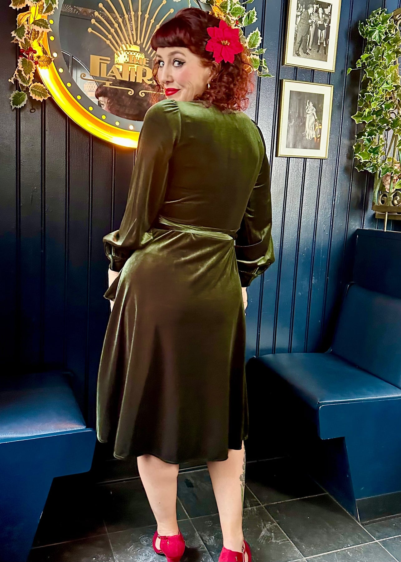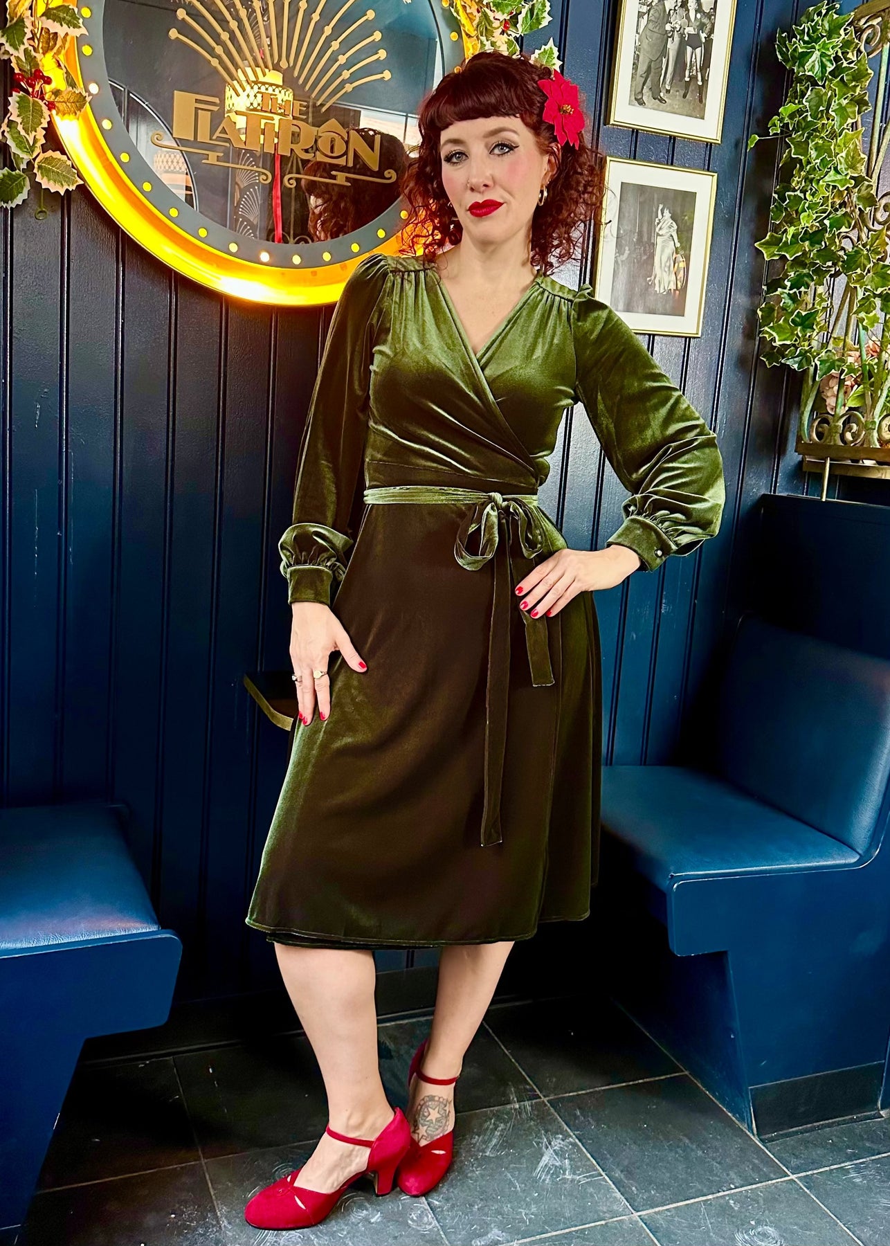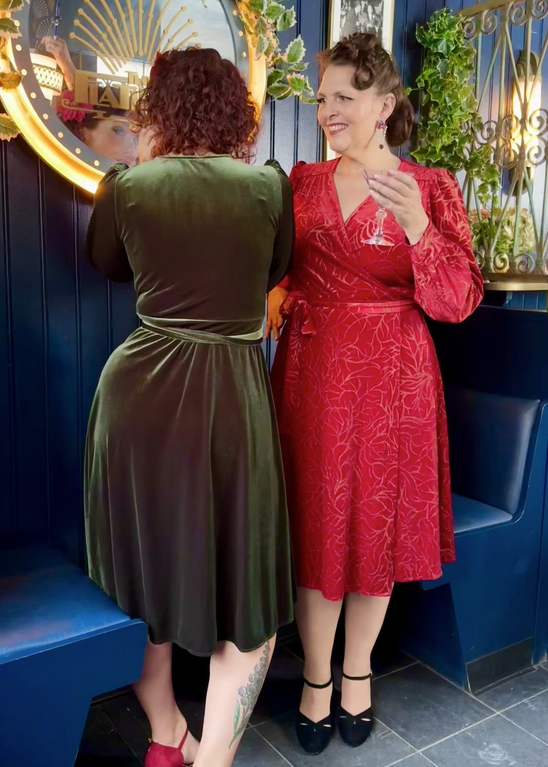 The Dalida wrap dress has ruching at the shoulders to give a nice cut over the bust. The wrap dress gives a nice V-neck and is adjusted with the tie belt for the right fit at the waist.