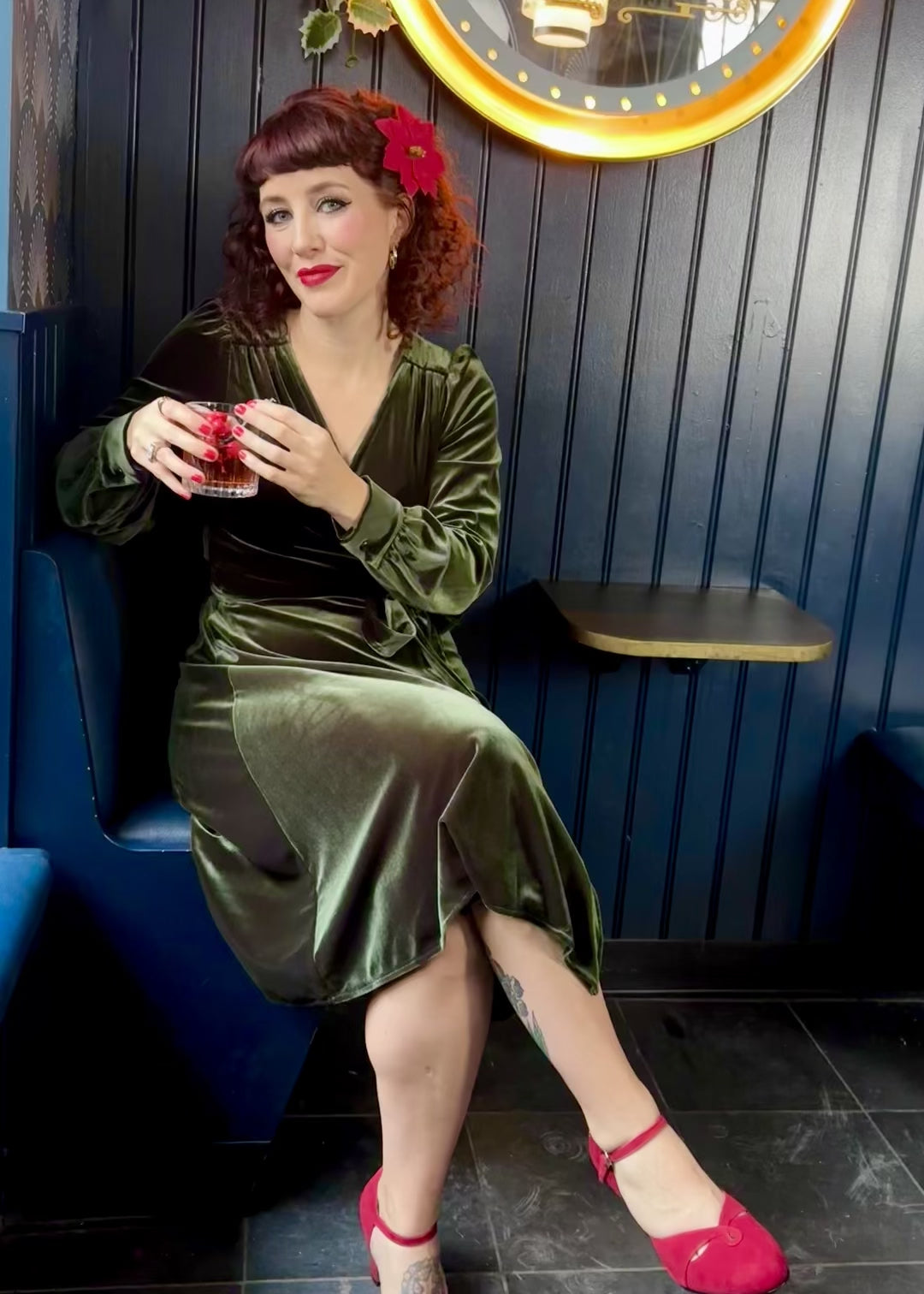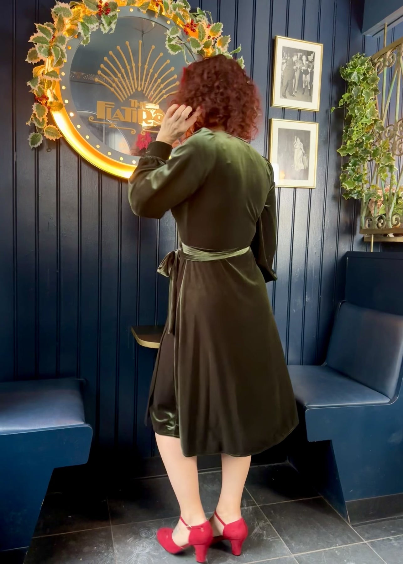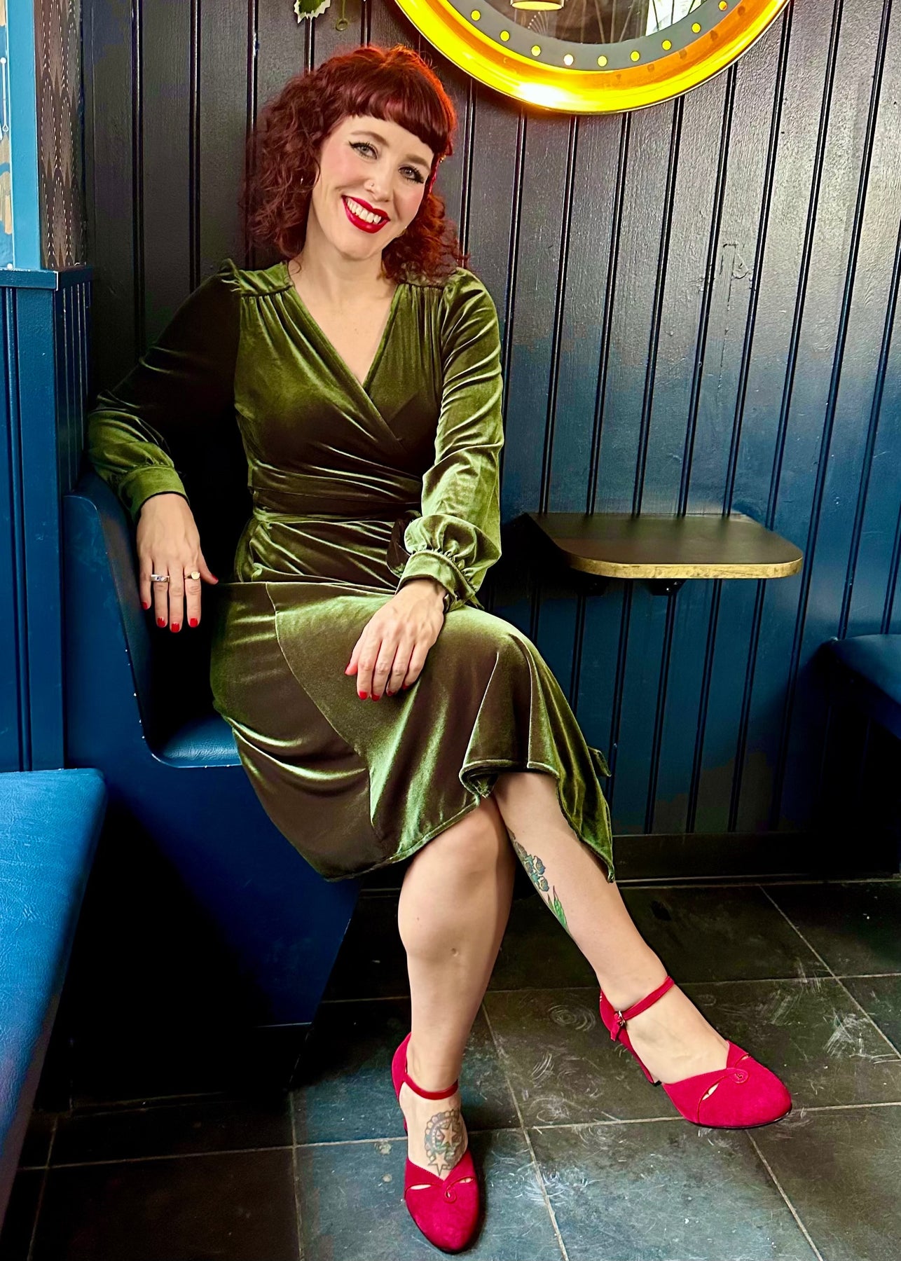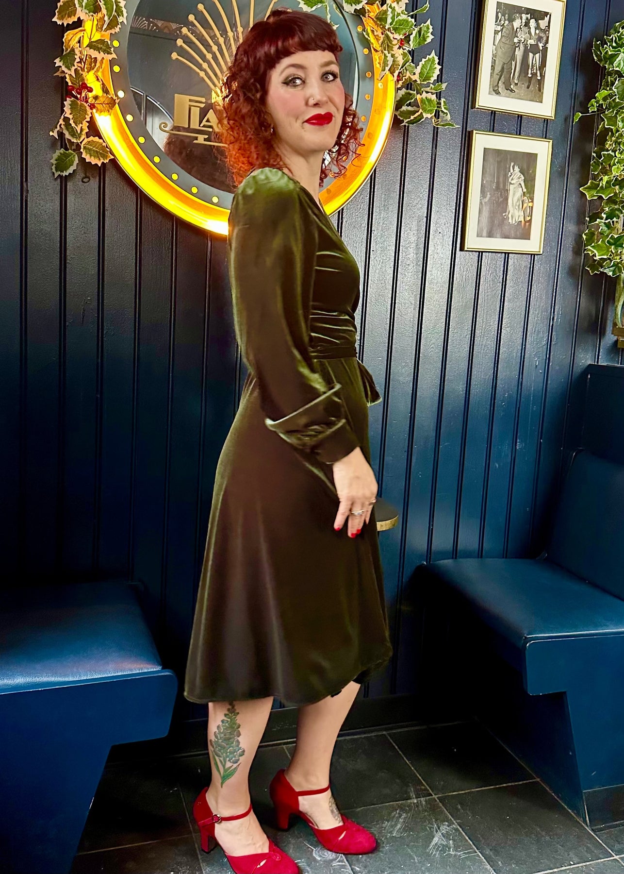 The fabric is a soft and comfortable stretch velour in beautiful olive green. The velvet shimmers beautifully and looks especially nice in the evening light.