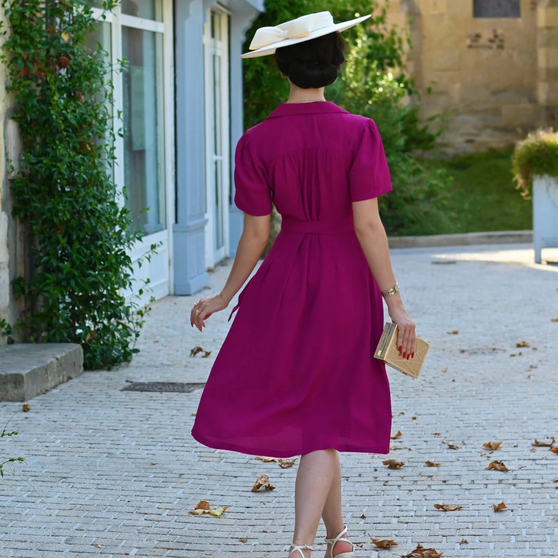 The cut of the dress leaves room for the bust and emphasizes the waist, and the fine lapel collar frames the neck and face beautifully.