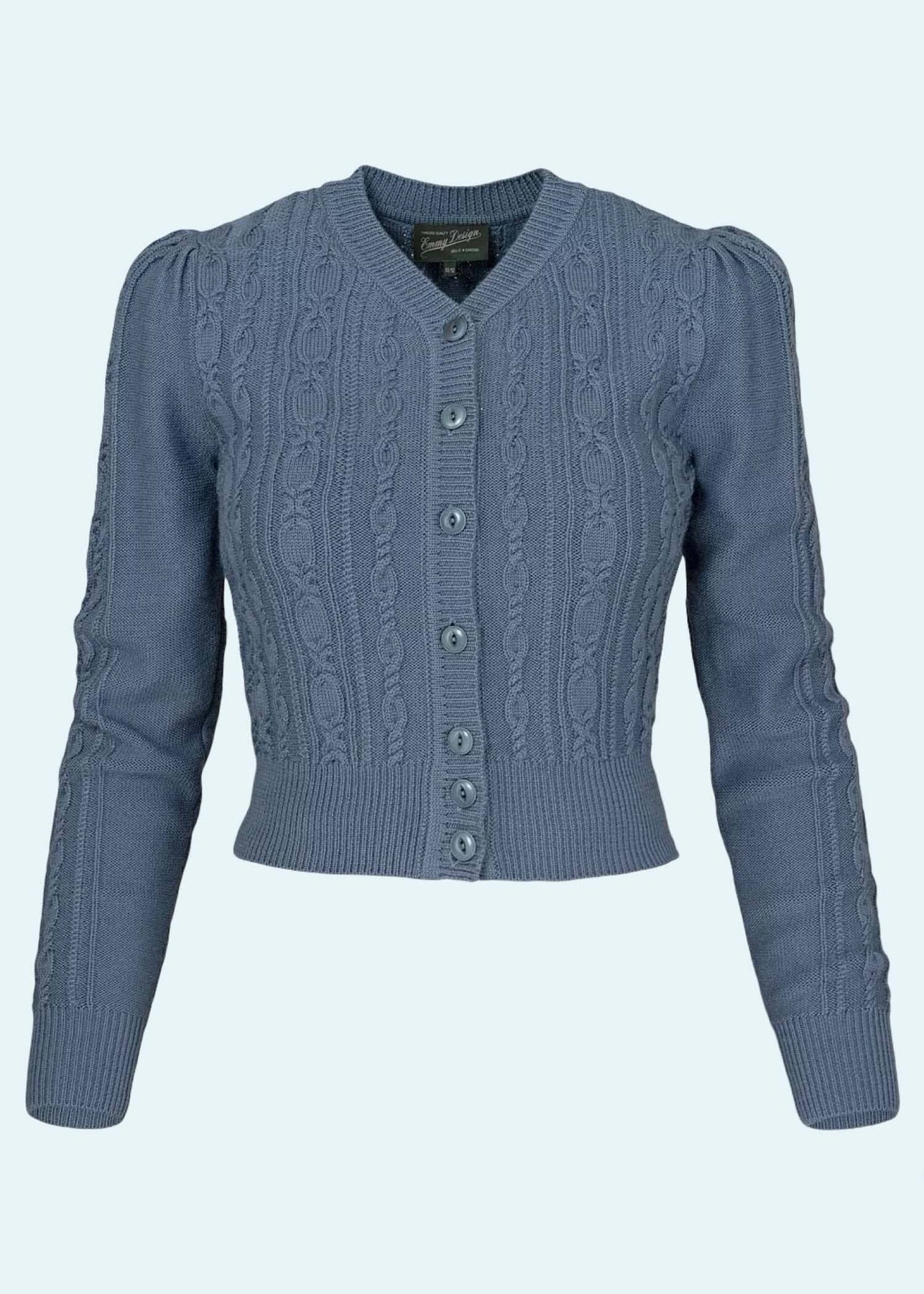 The Ice Skater Cardigan is a customer favorite no wardrobe should be without. With its flattering cable knit, puffed shoulders, and high neckline, it radiates authentic vintage vibes. Designed to sit at the waist and hug the body, it’s the perfect match for all your feminine retro and vintage-inspired outfits that highlight the waist and hourglass silhouette.