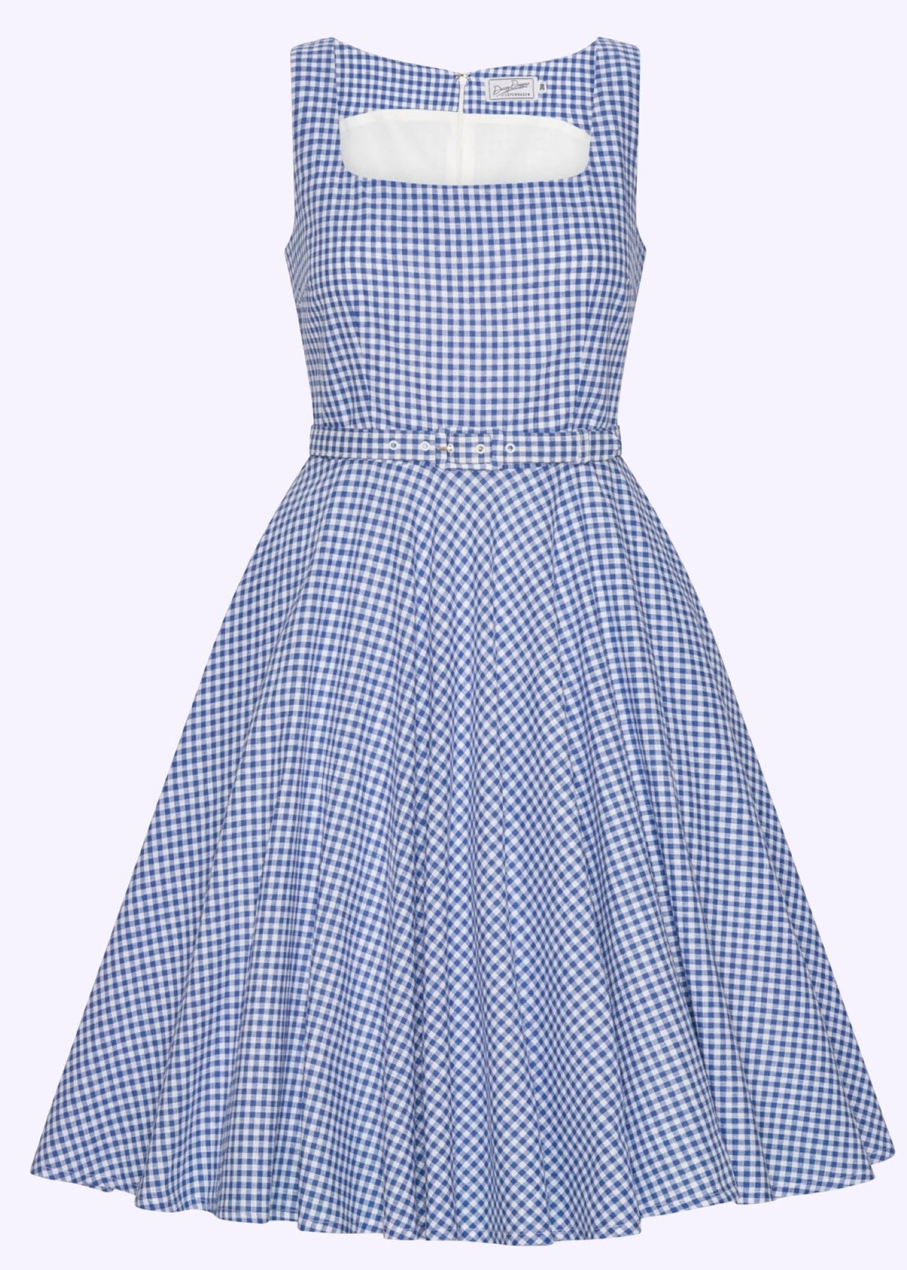 Vintage style swing dress with square neckline in blue and white checks from Daisy Dapper.