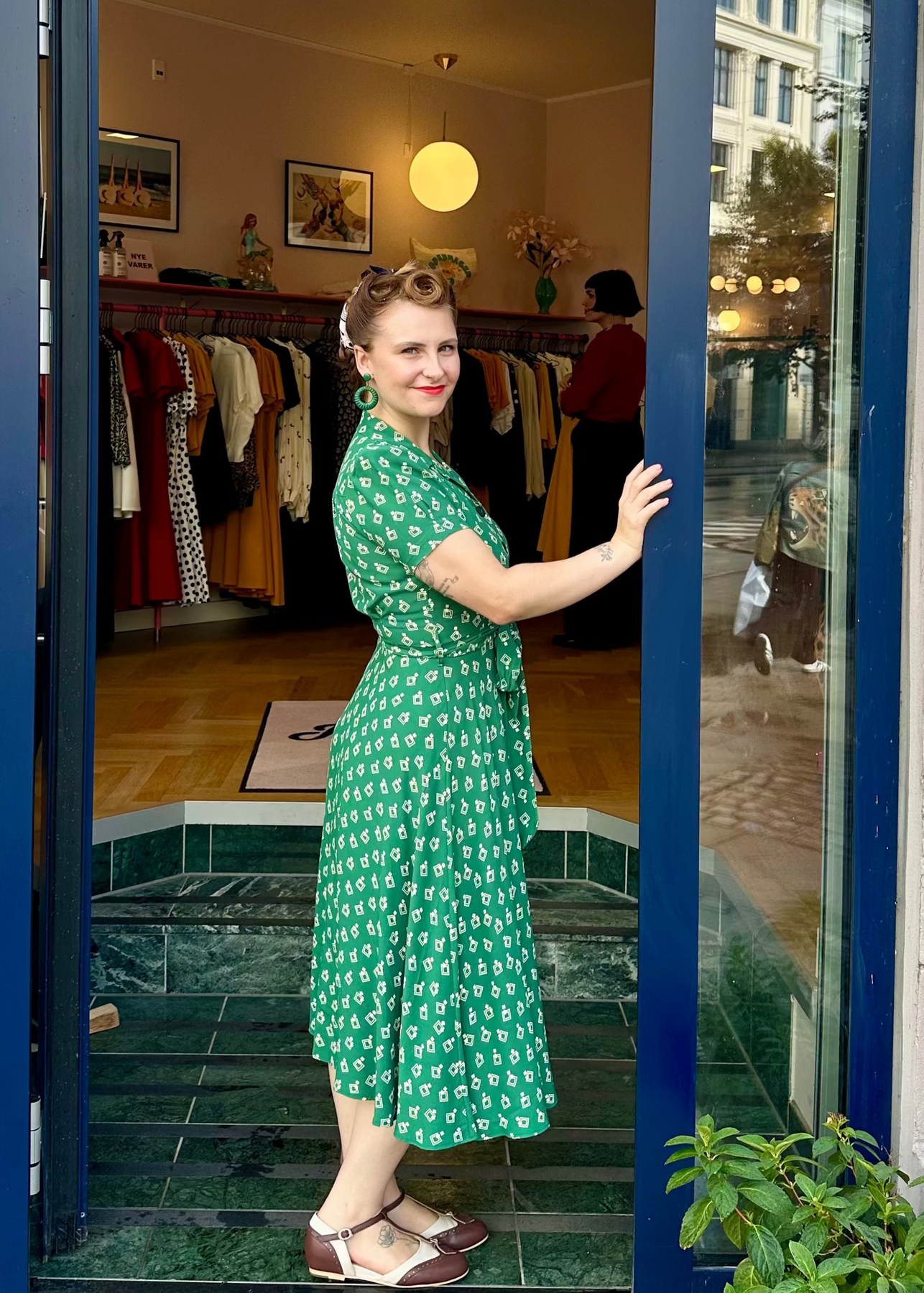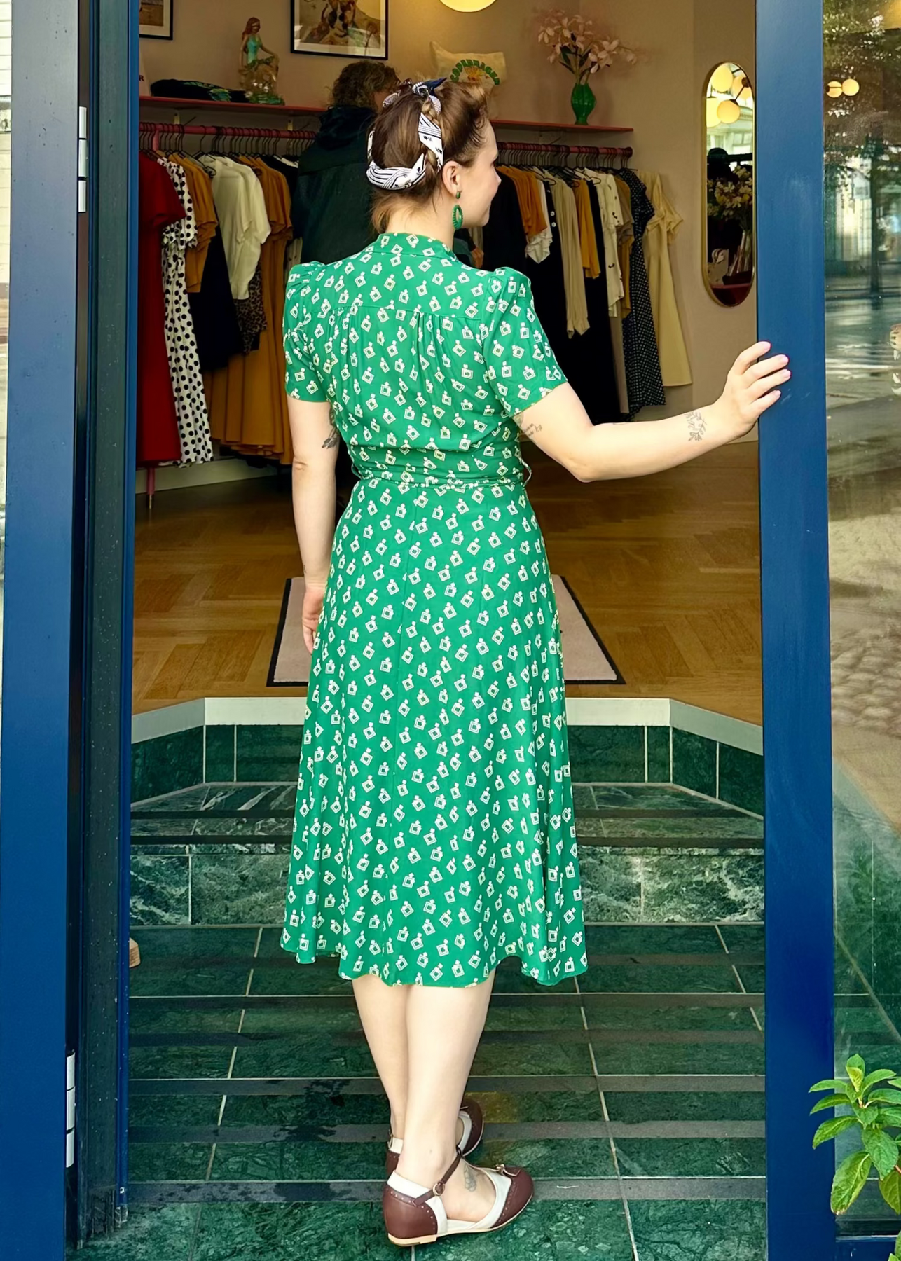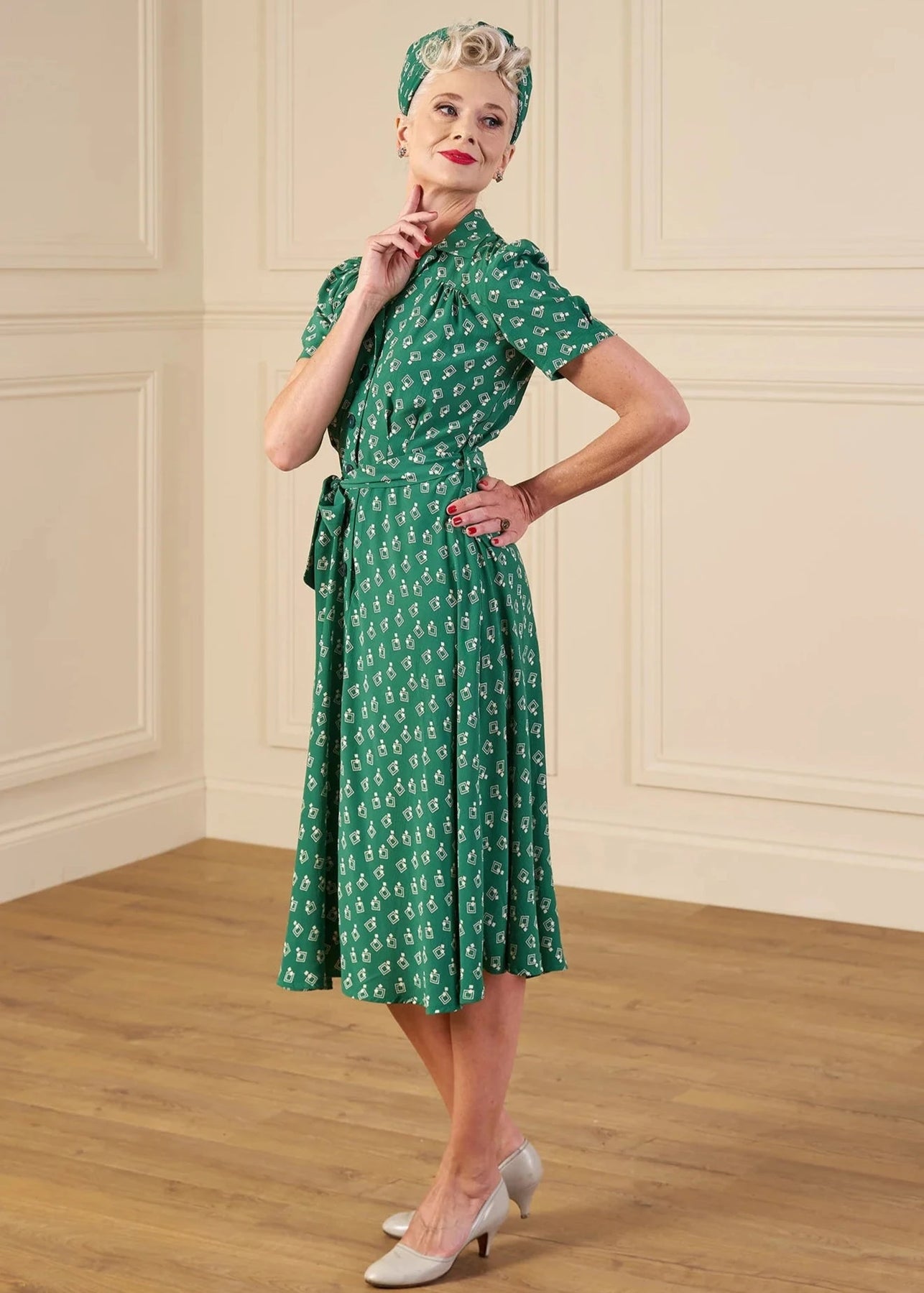 The short sleeves have small shoulder pads to emphasize the vintage style. The dress can be worn with a simple cardigan for everyday wear or with a fitted jacket with a fitted waist for more formal occasions.