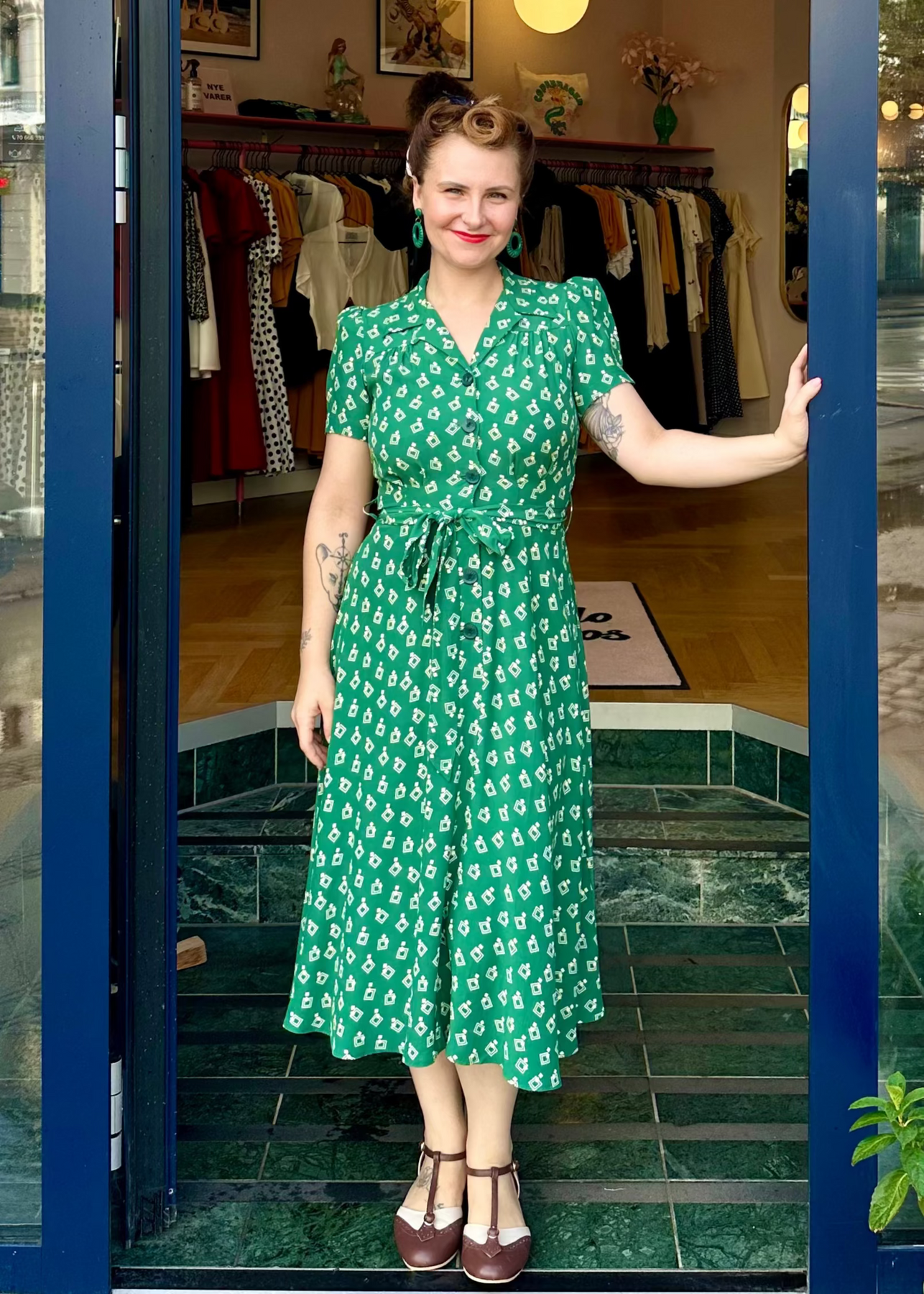 The dress has the classic lapel collar that gives a nice V-neckline when open. You'll also find a button under the collar that can be closed for a higher closure. The beautiful shirt dress has a front button closure in beautiful matching vintage style buttons and a tie belt helps to emphasize the waist.