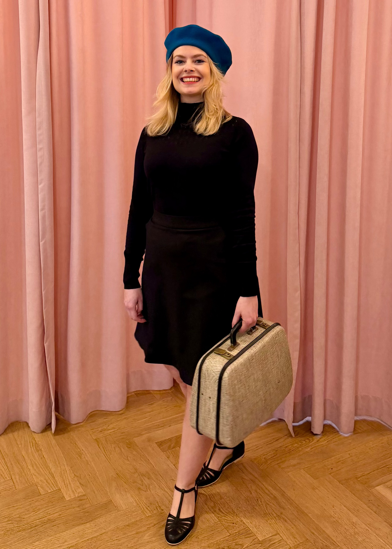 The skirt closes with a hidden zipper at the back and also has hidden side pockets.