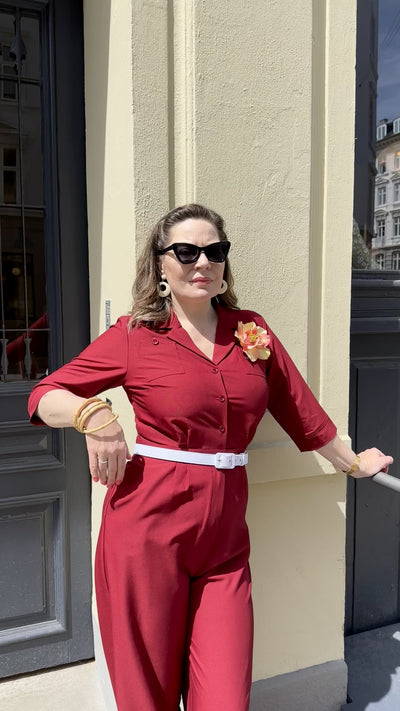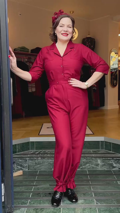 Feminine vintage style pantsuit in a beautiful burgundy with 3/4 length sleeves from Daisy Dapper!