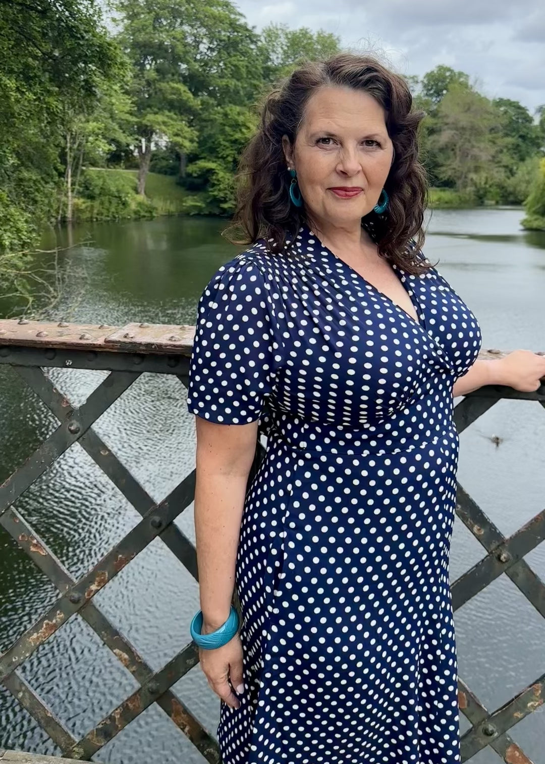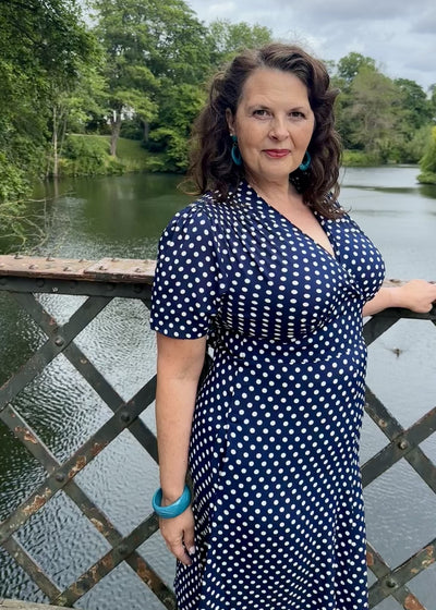The Dolores dress is in navy with fine medium-sized polka dots that give the dress a touch of extra vintage nostalgia.