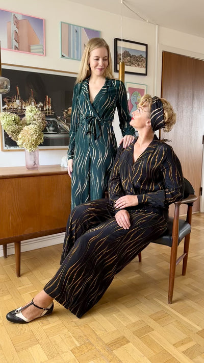 Long-sleeved pantsuit from King Louie in dark green with beige polka dots.