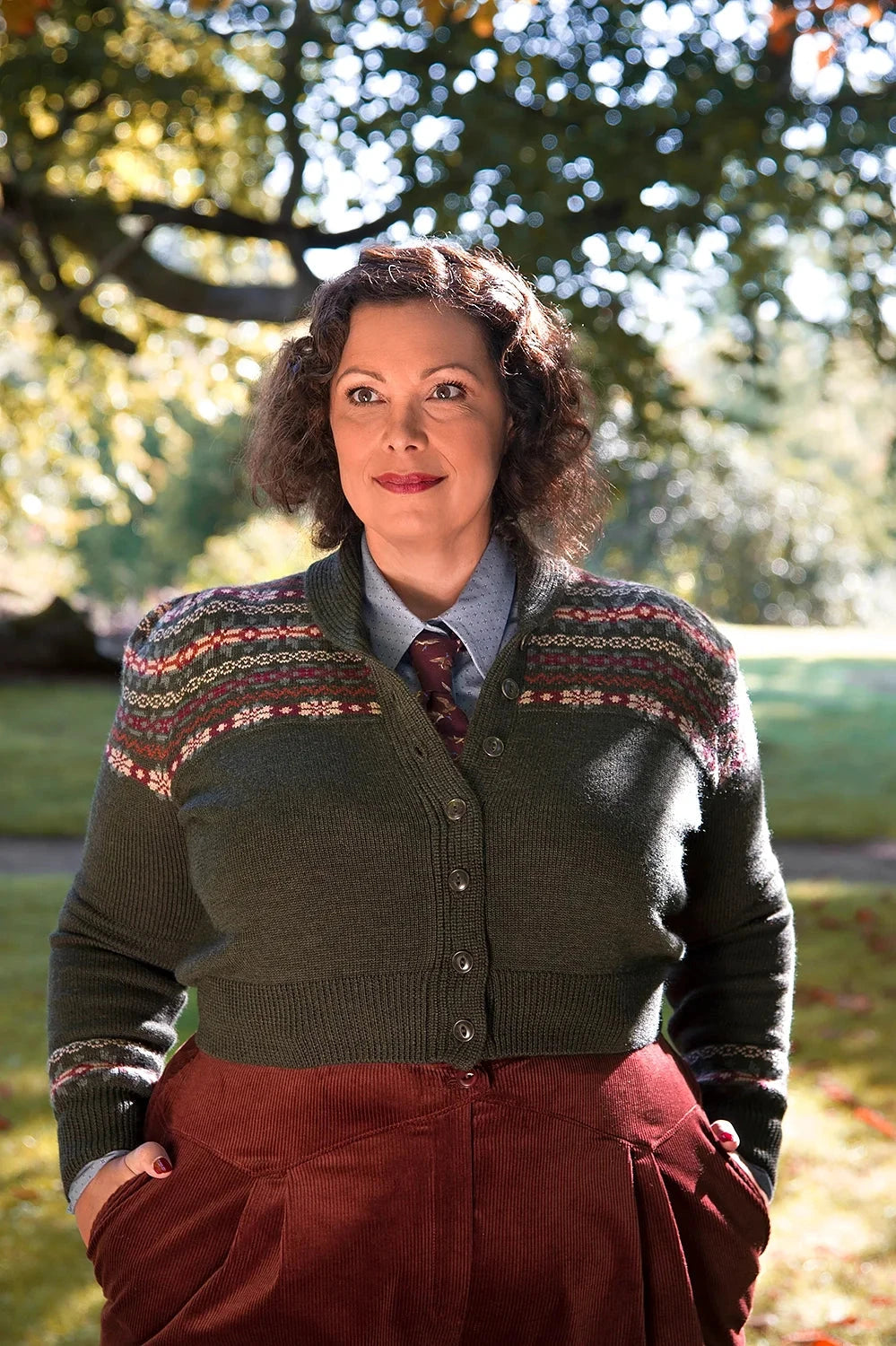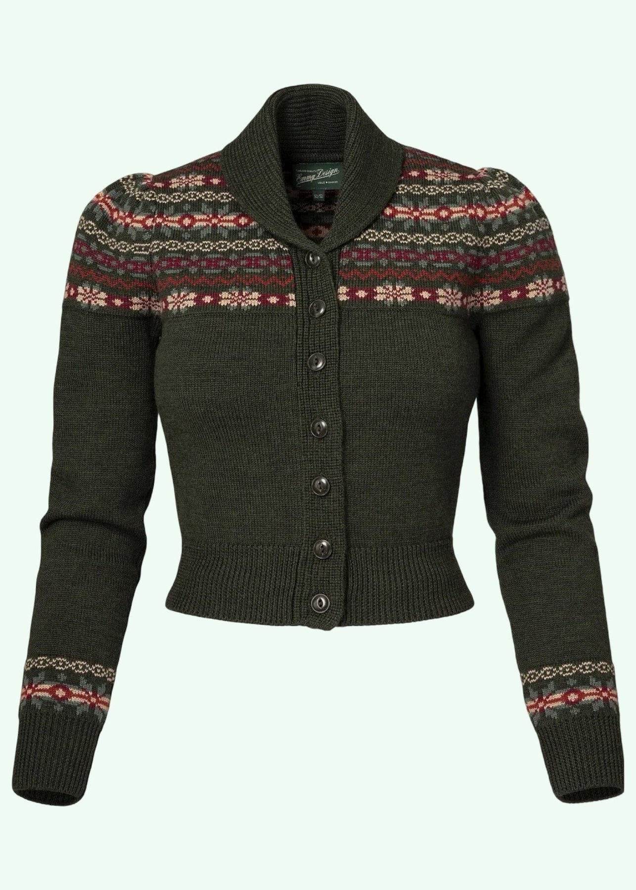 The slim sleeves have puffed shoulders and display the charming fair-isle star motif just above the ribbed cuffs. The cardigan has Emmy’s signature cropped length, ending at the natural waist and fitting close to the body, making it a perfect match for your vintage wardrobe.