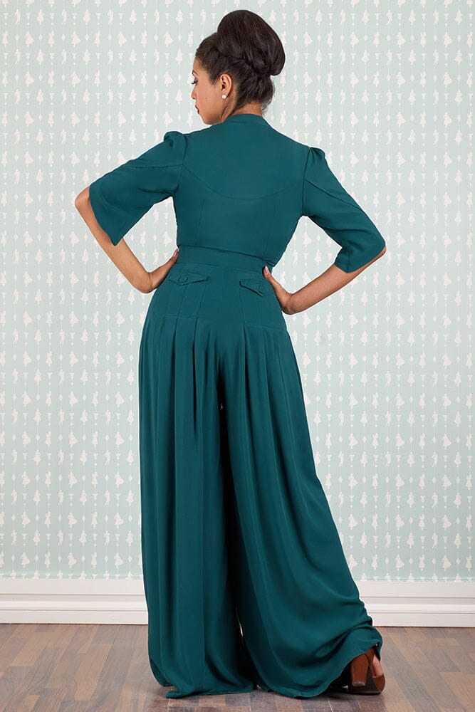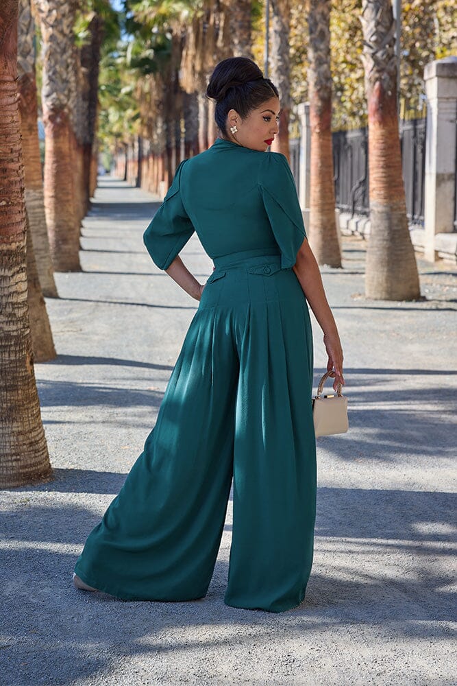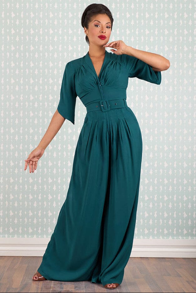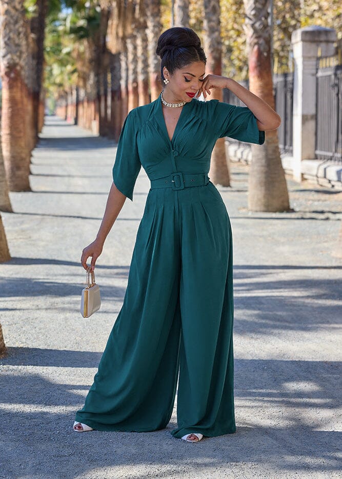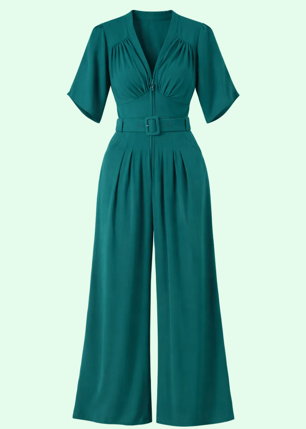 Step into effortless elegance with this beautiful jumpsuit, designed with a timeless vintage feel and modern comfort. The softly pleated bust enhances your natural shape, while the fitted waist creates a flattering hourglass silhouette.