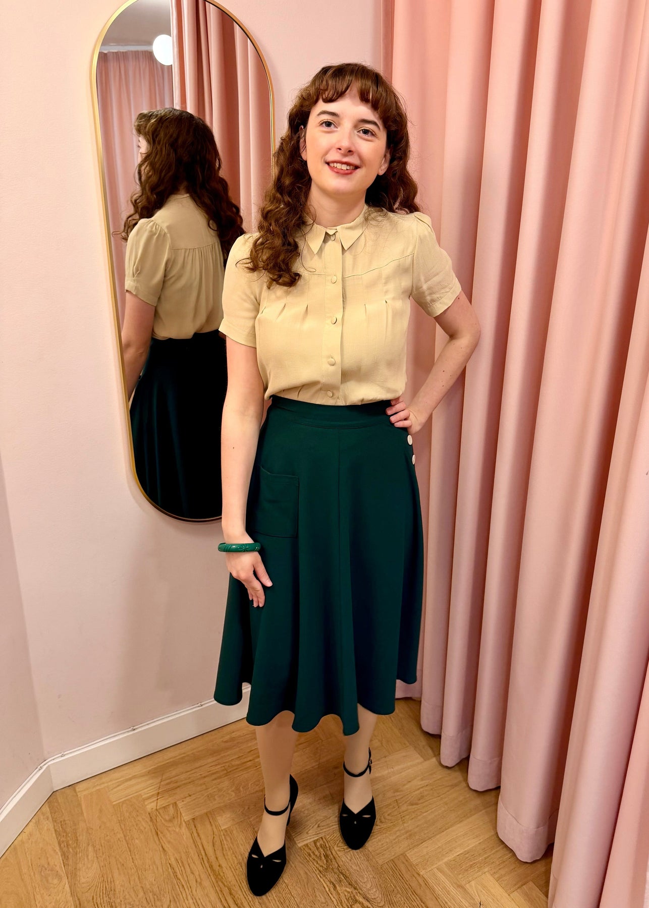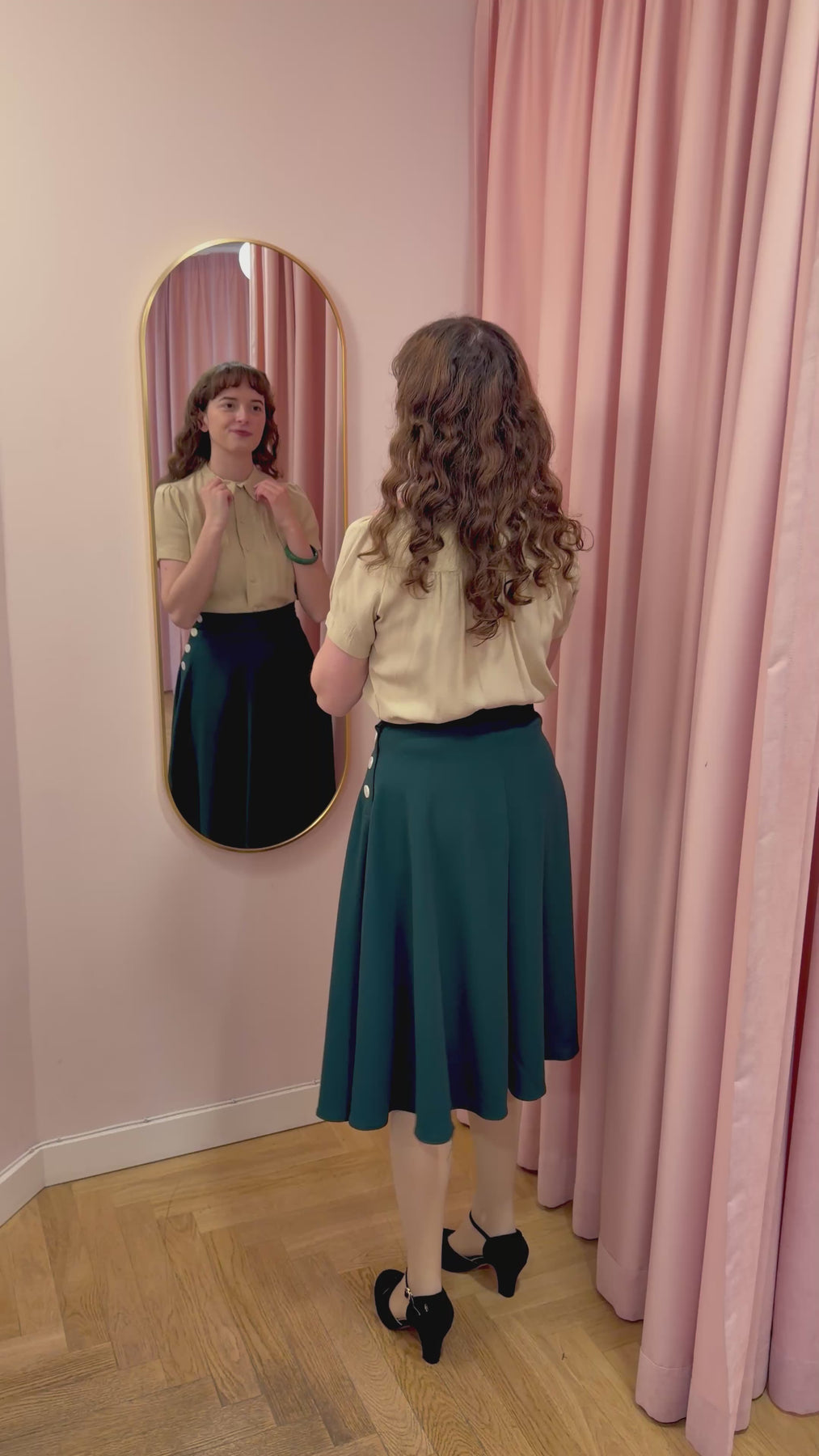 The shirt has a cute little collar, and can be buttoned all the way up, with the nice covered buttons. The sleeves have small extra pleats at the shoulders for a little extra fullness, and an authentic vintage look. The shirt has pleats at the bust and on the back, before it, again with the help of incisions, gives a perfectly waisted figure.