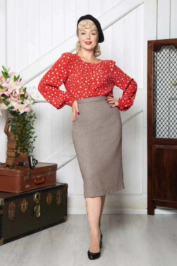 The Ingrid skirt is inspired by the timeless 1940s silhouette. A fitted waistband and subtle tailoring highlight the feminine shape, creating a beautifully elegant look.
