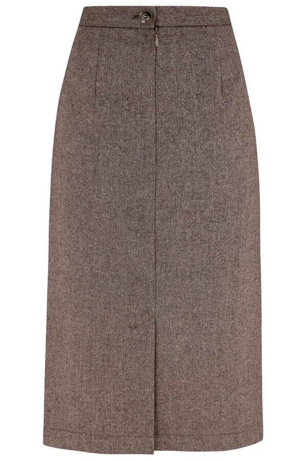 Crafted from a luxurious wool blend with a beautiful brown herringbone pattern, and partially lined for comfort. Fastens at the back with a zip and button.
