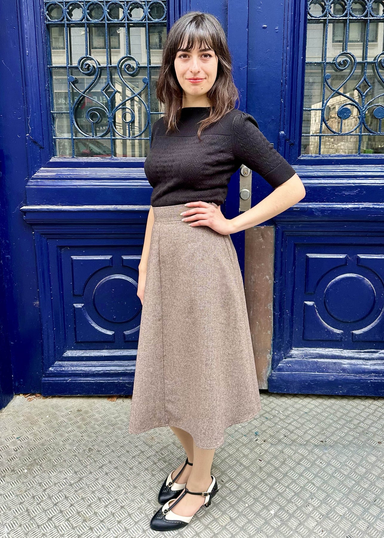 This short-sleeved vintage-inspired sweater features an elegant boat neckline that frames the shoulders gracefully. The slightly puffed sleeves add a subtle 1940s silhouette, while the delicate openwork pattern on the body and sleeves creates a light, airy feel — perfect for spring and summer.
