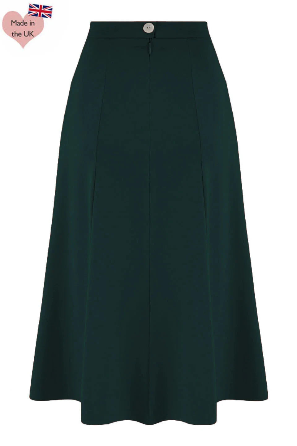 The Betty skirt closes with a button and zipper at the back