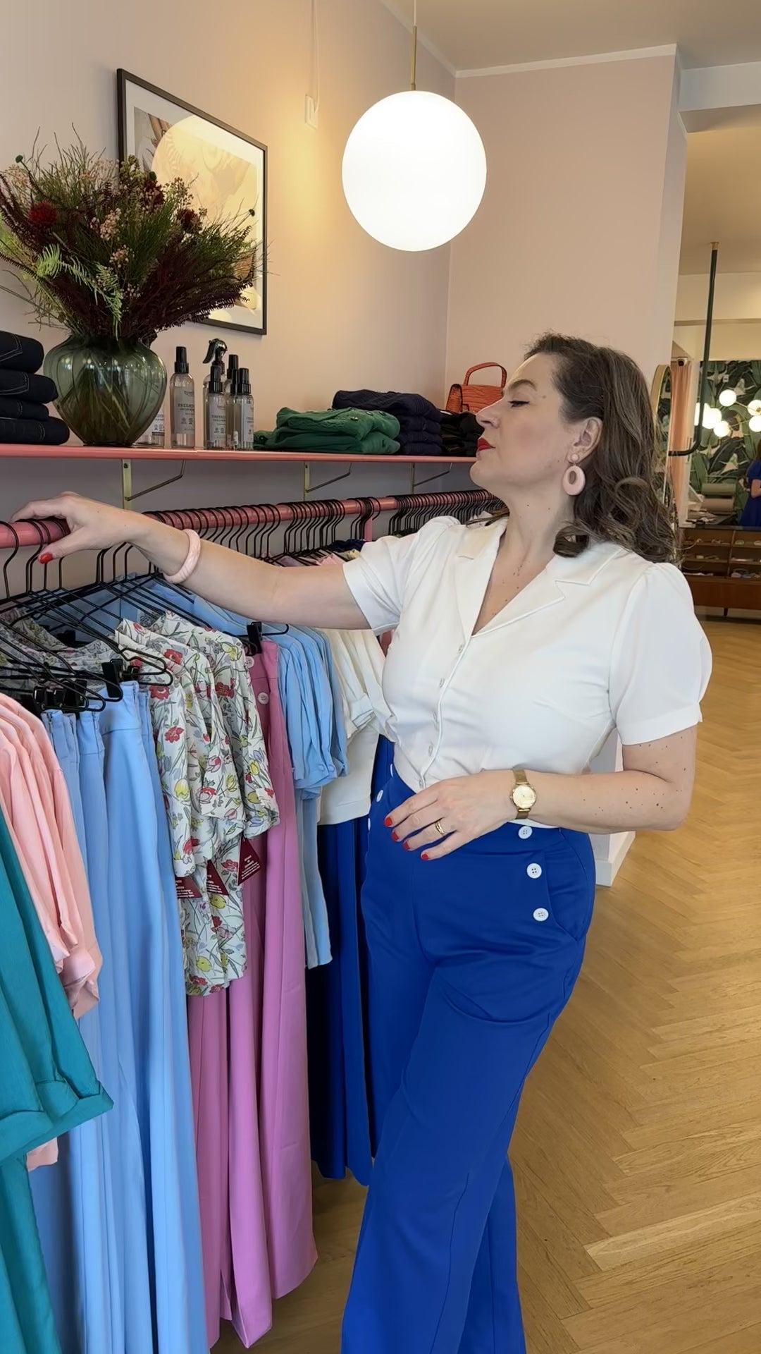 The trousers are fitted at the waist and have wide legs for a vintage look. The Sally pants close at the side and have pockets.