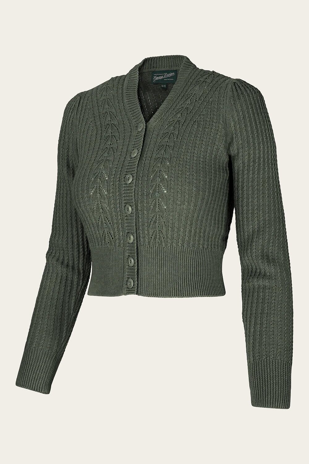 This V-neck cardigan has already become a true wardrobe staple. Knitted in soft wool with delicate lace-knit details, inspired by 1930s–50s knitwear traditions, it beautifully combines functionality with feminine retro style.