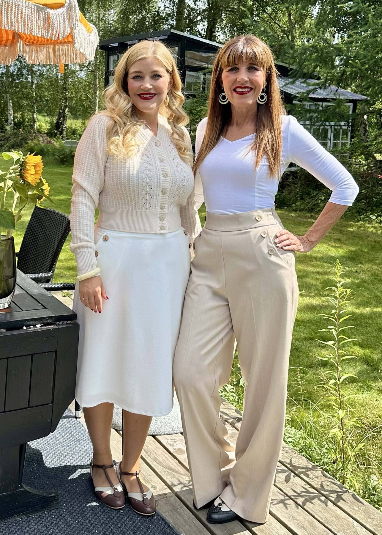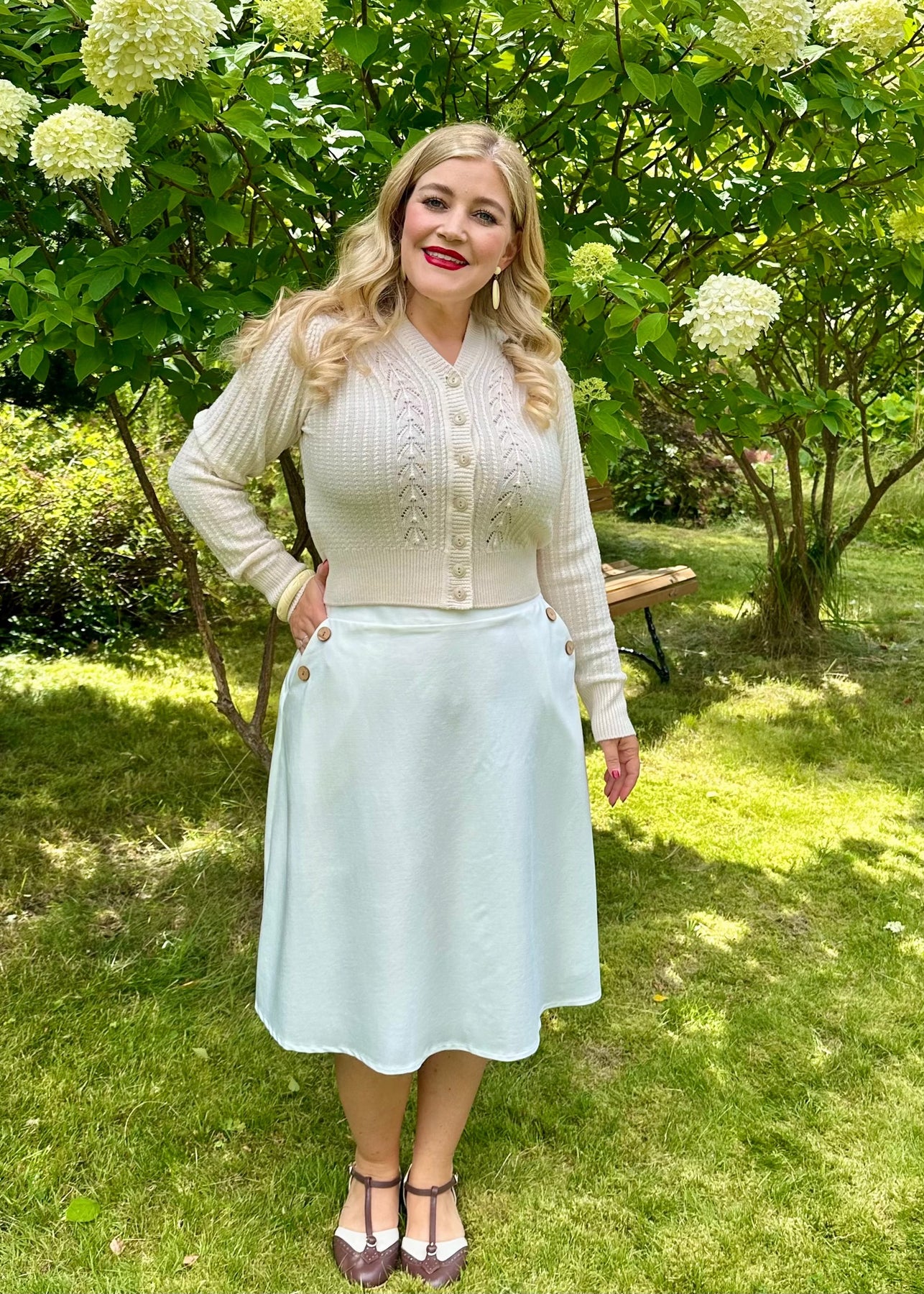 The cardigan has the familiar Emmy cut and sits close to the body, ending at the waist with a wide rib to emphasize the classic hourglass figure.