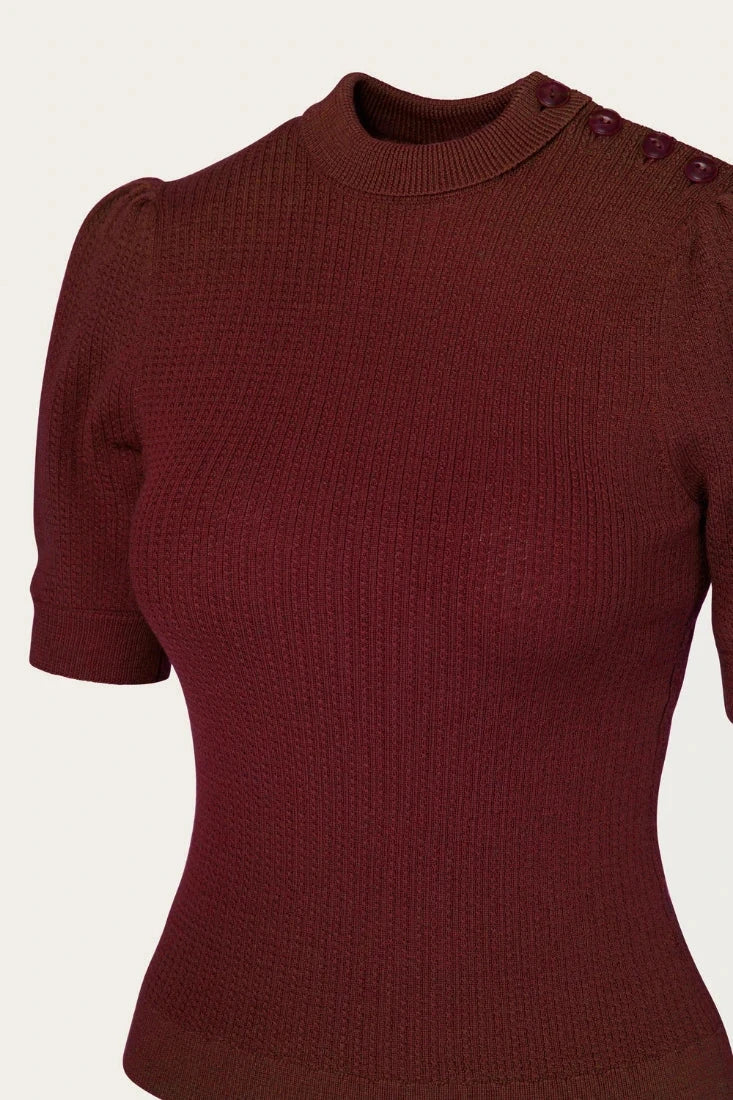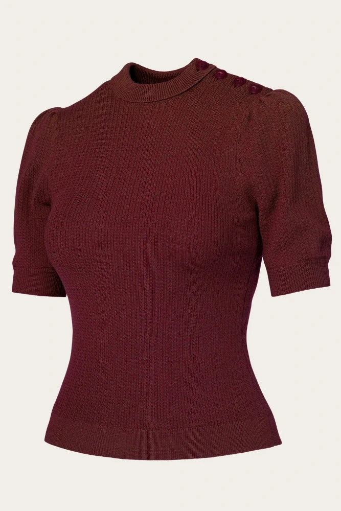 A vintage-style short-sleeved sweater with puff sleeves and shoulder buttons.