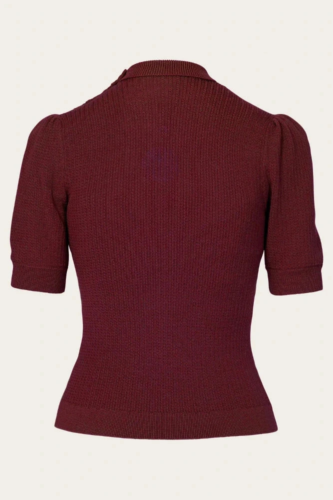 The short sleeves have puffed shoulders and finish with a slim ribbed cuff, allowing a touch of volume at the sleeves. The blouse is knitted in wonderfully soft and lightweight merino wool, designed to fit close to the body and highlight the hourglass silhouette.